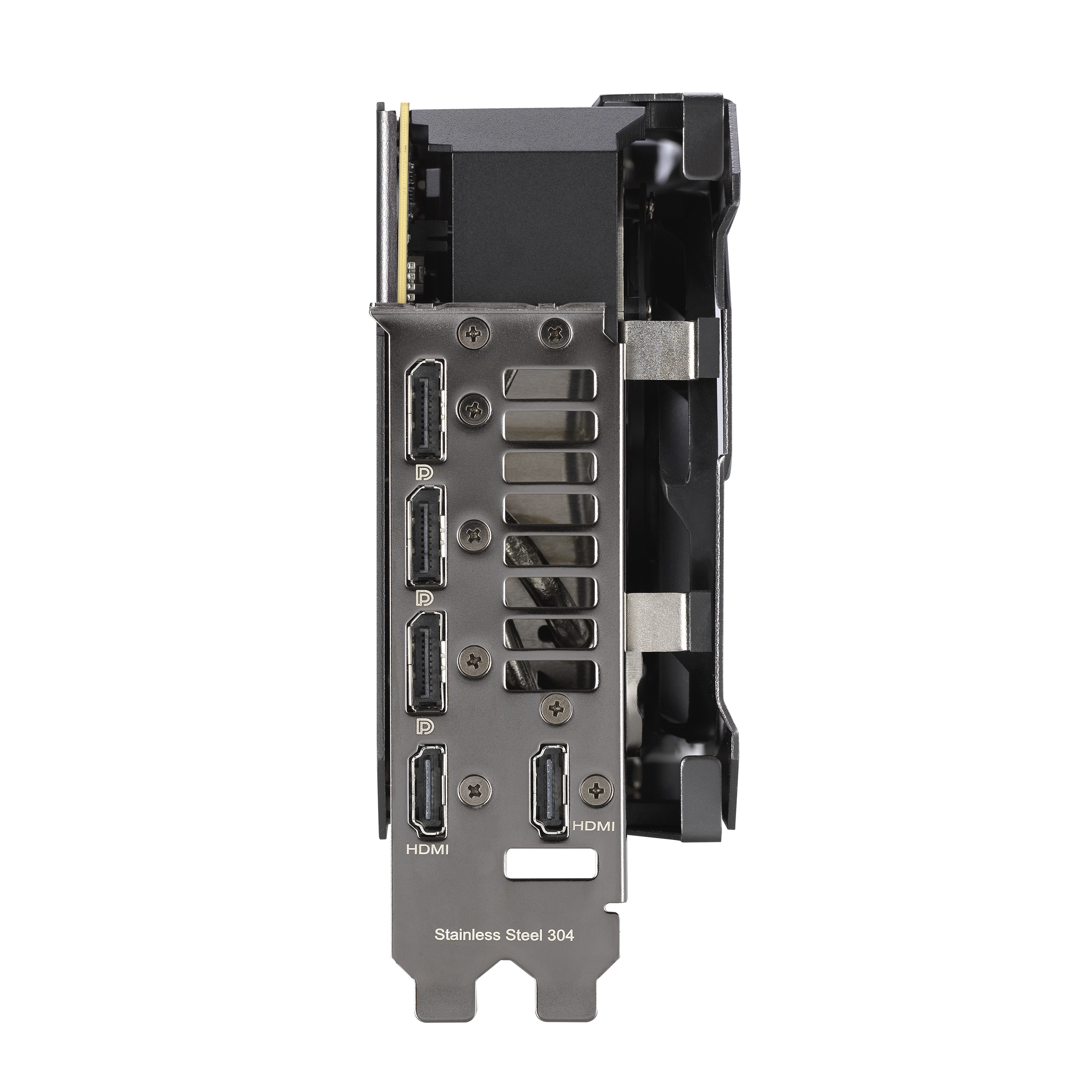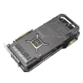 Most of the rear is swathed in a protective metal backplate that prominently features a wide vent. The vent allows hot air to escape towards chassis exhaust fans instead of being recycled back into the GPU cooler.