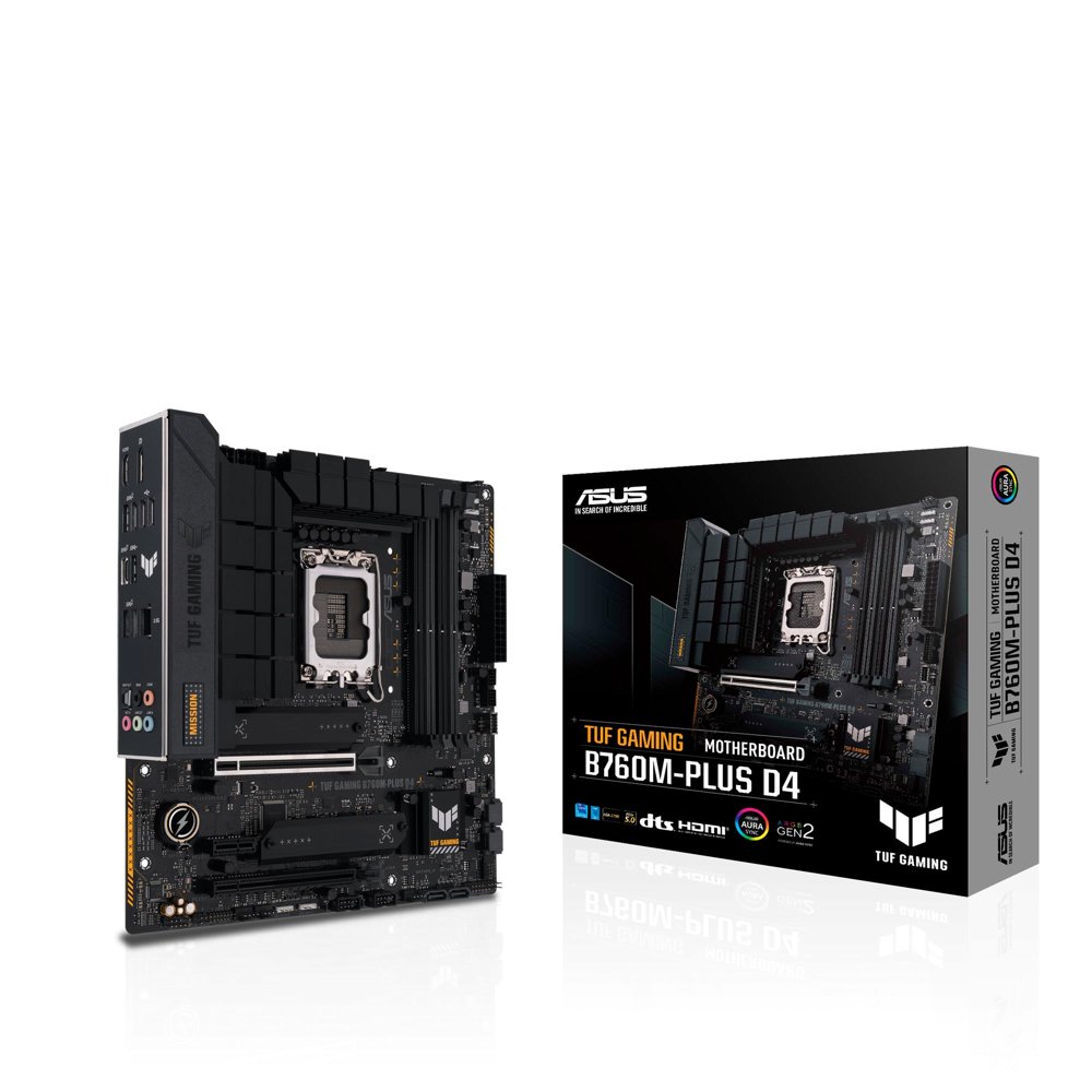 ASUS TUF GAMING B760M-PLUS D4. Processorfabrikant: Intel, Processor socket: LGA 1700, Compatibele processors: Intel® Celeron®, Intel® Core™ i3, Intel® Core™ i5, Intel® Core™ i7, Intel® Core™ i9,. . . . Ondersteunde geheugen types: DDR4-SDRAM, Maximum intern geheugen: 128 GB, Geheugen slots type: DIMM. Ondersteunde opslagstationinterfaces: M.2, SATA III, Ondersteunde types opslag-drives: HDD & SSD, Soorten RAID: 0, 1, 5, 10. Ethernet interface type: 2.5 Gigabit Ethernet. Component voor: PC, Moederbord form factor: micro ATX, Moederbord chipset familie: Intel