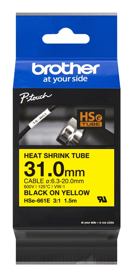 Brother HSe-661E Black on Yellow Heat Shrink Tube Tape – 31.0mm. Suitable for cables between 6.3mm and 20.0mm in diameter.