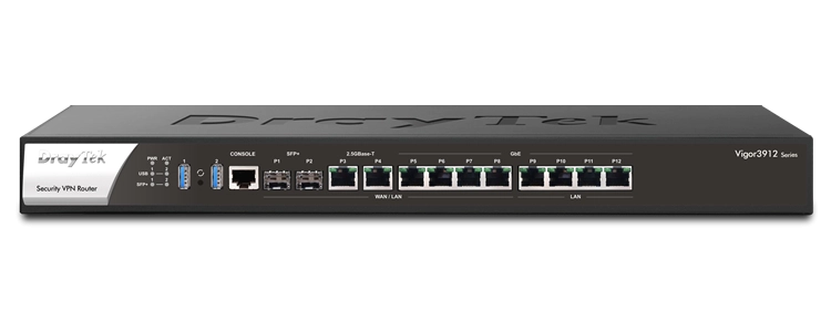 Vigor 3912 High performance 10G router met 8 configureerbare WAN/LAN poorten (waarvan 2x 10G SFP+ en 2x 2, 5G en 4x 1G poorten) + 4 gigabit LAN poorten, 15, 6 Gbps NAT doorvoer (Bi-directioneel), 500 VPN met totaal 5, 7 Gbps performance, 100 subnetten, IPv6