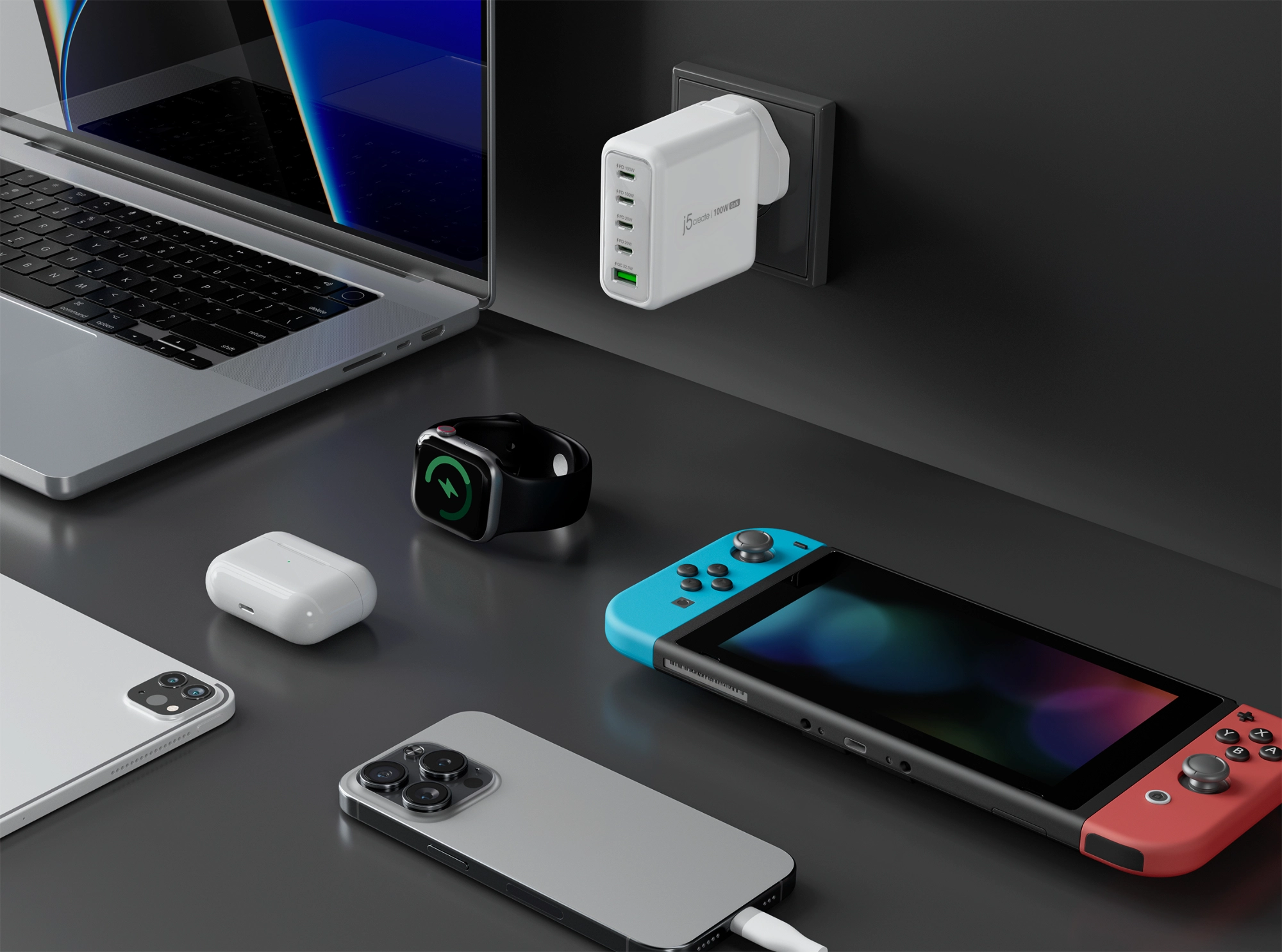 Special features The 100W GaN USB-C® 5-Port Charger can simultaneously charge 5 devices. The charger uses GaN technology, which enables it to deliver a significant amount of power in a small package. All the USB-C® ports support Power Delivery 3.0/2.0 technology, the USB™ Type-A port supports QC™ 22.5W fast charging. When using just one of the ports, the first or second port can support up to 100W, enabling MacBook®, laptops, tablets, handheld game consoles, and other mobile devices to charge at the fastest rates possible. The third and fourth ports support up to 20W, enough for charging a second tablet or phone. The product maintains 45W on the first port, while other port(s) is/are being used. So, you can seamlessly charge your laptop and other devices at the same time. With its small and light design, the charger can attach more firmly to the wall, reducing the chance of the charger falling off the wall. Equipped with safety features which include: surge, overcharging, overcurrent, and overheating protection to keep your devices protected.