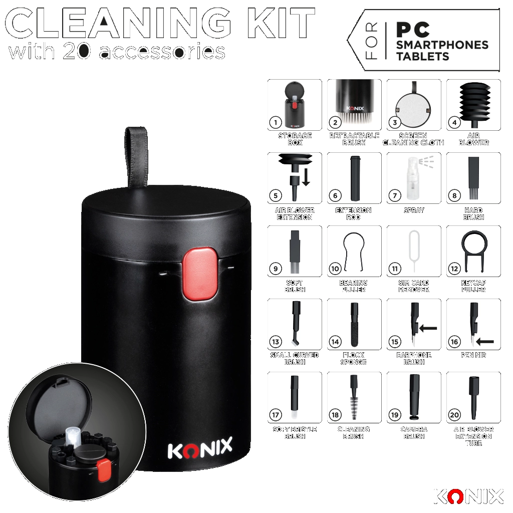For Phone: Small elbow brush, Short-bristled soft brush, Earphone brush, Pen tip, Flocked sponge, Cleaning brush, SIM card removal tool, Spray bottle (empty bottle), Cleaning cloth, Camera screen brush, Mini air blower, Short extension tube for air blower, Extension tool