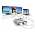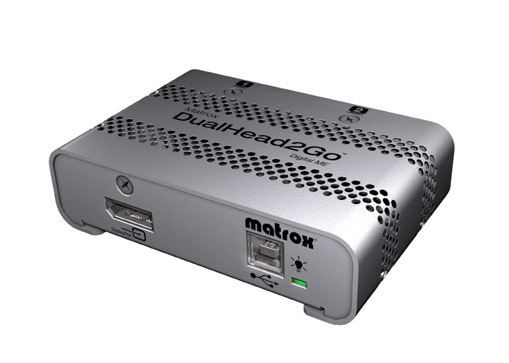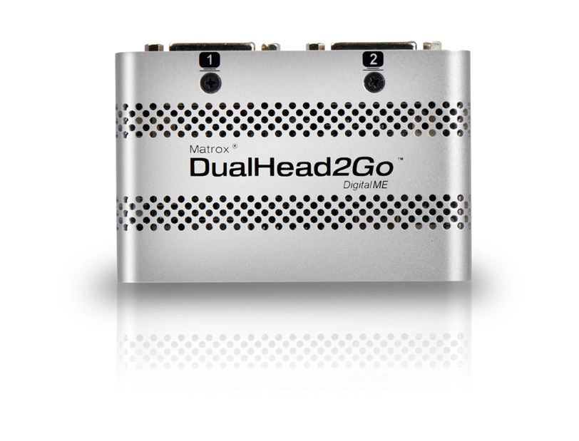 The Matrox Dualhead2Go Digital Mac Edition (ME) external multi-display adapter adds up to two monitors to your laptop or desktop computer. It connects to the video output of your system and uses the system's existing GPU to provide high-quality, uncompressed graphics and video across all monitors. Ideal for business users and content creators looking to increase their productivity with a dual display setup, this little silver box lets you run different applications on each monitor or view one application across two monitors.
