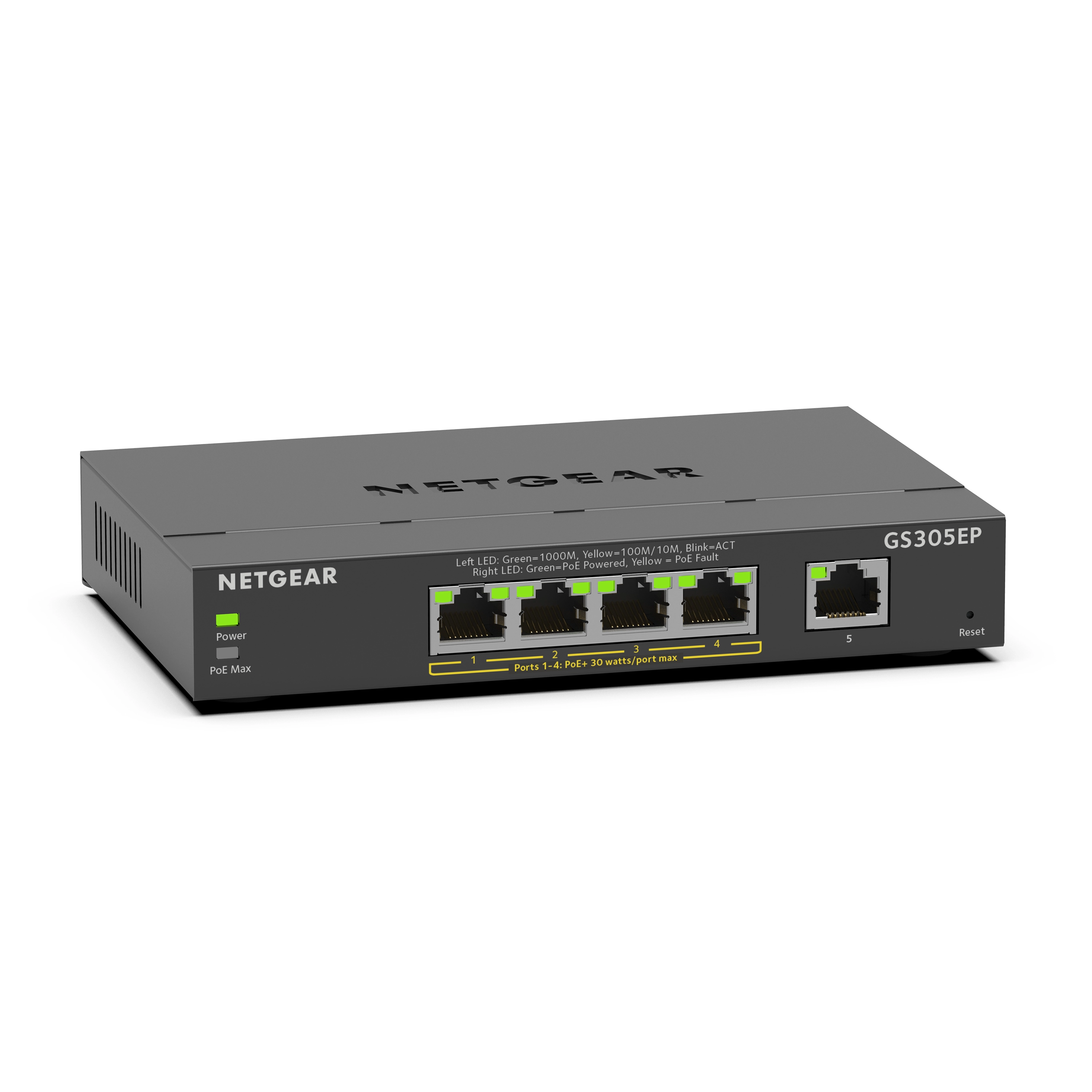 Netgear GS305EP. Switch type: Managed, Switch layer: L2/L3. Basic switching RJ-45 Ethernet ports type: Gigabit Ethernet (10/100/1000), Basic switching RJ-45 Ethernet ports quantity: 5. Full duplex. MAC address table: 4000 entries, Switching capacity: 10 Gbit/s. Networking standards: IEEE 802.3, IEEE 802.3ab, IEEE 802.3u, IEEE 802.3x, IEEE 802.3at, IEEE 802.3af. Power over Ethernet (PoE)