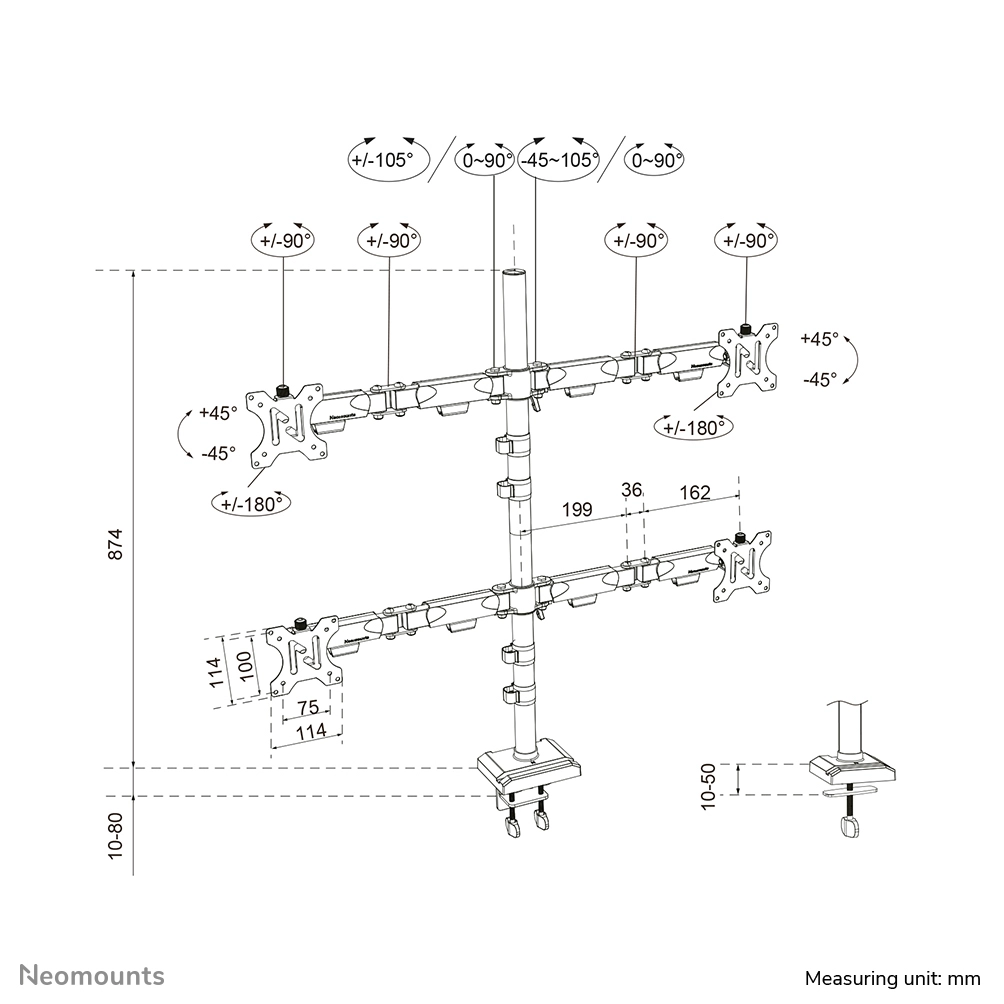 This model is specifically suited for financial institutions, control rooms, and corporate offices where the simultaneous management of vast amounts of data is essential. The robust construction guarantees maximum stability, while the integrated 180° lock mechanism protects the surrounding environment by preventing the arms from making contact with walls or partitions. The design features a subtle phone slot in the base and an integrated cable management system to maintain a professional and organized workspace.