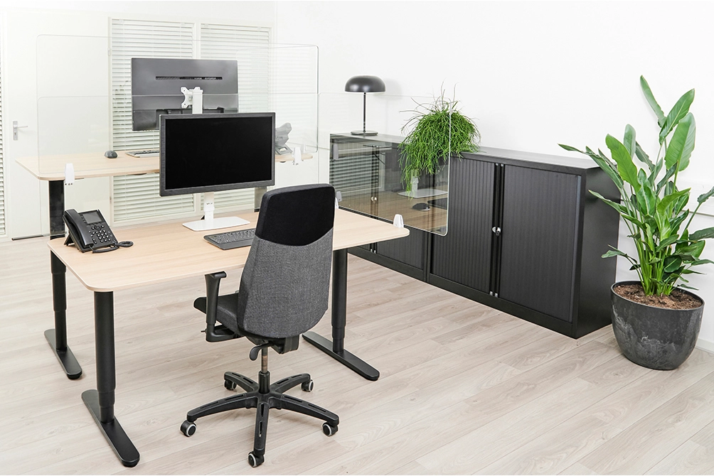 With the NS-GLSPROTECT, the workplace can be shielded from the front and side in a durable and stylish way, to create extra safety and distance from others. The series consists of 4 models with different sizes; the NS-GLSPROTECT100, NS-GLSPROTECT120, NS-GLSPROTECT140 and NS-GLSPROTECT160, for respectively 1 m, 1, 2 m, 1, 4 m and 1, 6 m desks. All models are 65 cm high and 6 mm thick and made of laminated and tempered glass. The tempered glass adds an extra safety aspect to the screens; the transparent film between the two layers of glass increases the resistance and ensures that the glass stays in place and does not shatter, in the extreme case that the glass of the screen should break. The NS-GLSPROTECT models can be easily attached to the desk with two clamps and therefore move with the height-adjustable desk. The models can be used as desired for both the front and the sides of the desk, to create optimal safety. When mounted to the side of an average desk, the screen protrudes beyond the desk, automatically creating a barrier between the user and any person at the desk next to it. The NS-GLSPROTECT products are 100% recyclable, very user-friendly, easy to install and easy to clean.