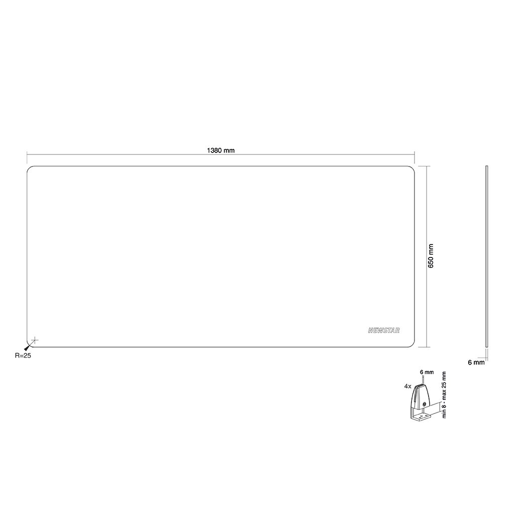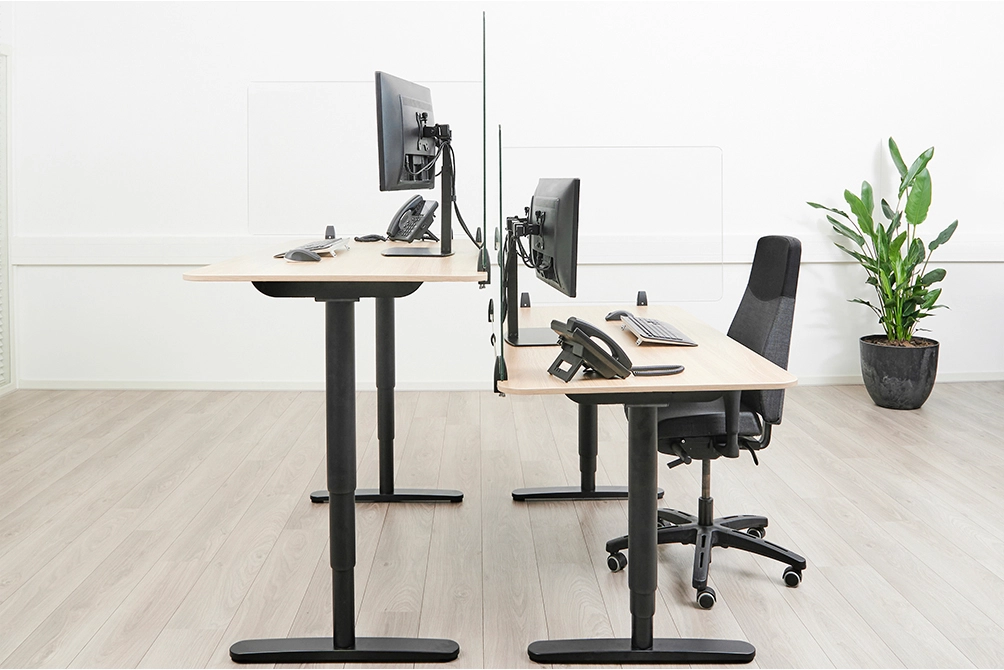 The NS-GLSPROTECT140 is 1, 38 m wide x 65 cm high and suitable for desks with a maximum thickness of 25 mm*. The screen is made of 6 mm laminated and tempered glass and has rounded corners and edges for extra safety. The screen can be easily installed onto the desk with 2 clamps and offers a durable and stylish solution for the new way of working. The screen comes with both white and black clamps as standard. The clamps guarantee a solid and secure installation onto the desk and move smoothly with the sit-stand workstation when it is adjusted in height.