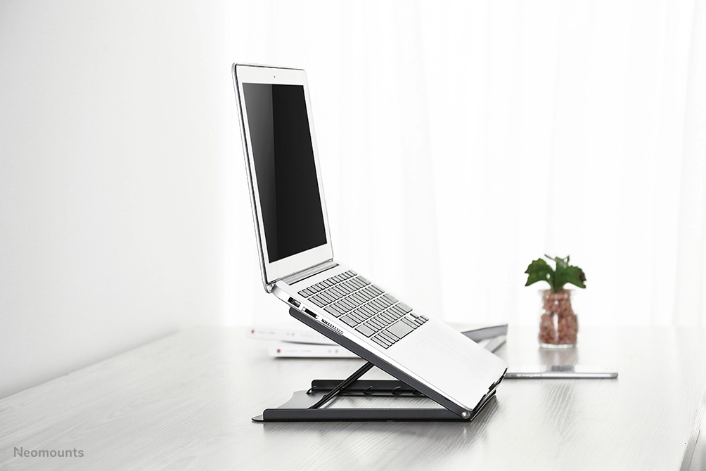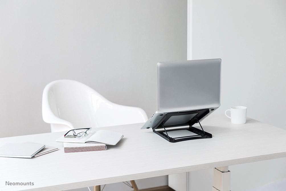The Neomounts by Newstar universal tablet and notebook stand, model NSLS075BLACK is a universal stand for notebooks. It offers five different tilt positions (10-60°) for maximum viewing comfort. Easy to fold flat, light weight and portable. The hollowed-out design, made out of powder coated steel with non-slip silicone pads, avoids over-heating problems for maximum tablet and notebook speed.
