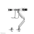 The Neomounts Select NM-D775DXSILVER is a tilt-, swivel and rotatable desk mount with crossbar and handle for 2 flat screens up to 32". This mount is a great choice for space saving placement on desks using a desk clamp or grommet mount.