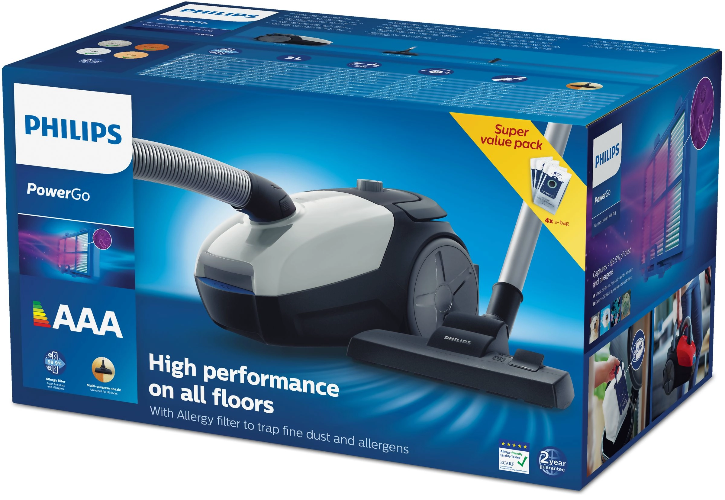Philips 2000 series FC8253/09. Maximum input power: 750 W. Type: Cylinder vacuum, Cleaning type: Dry, Dust container type: Dust bag, Dust capacity: 3 L. Vacuum air filtering: Allergy filter, Dirt separating method: Filtering, Noise level: 77 dB. Product colour: Grey