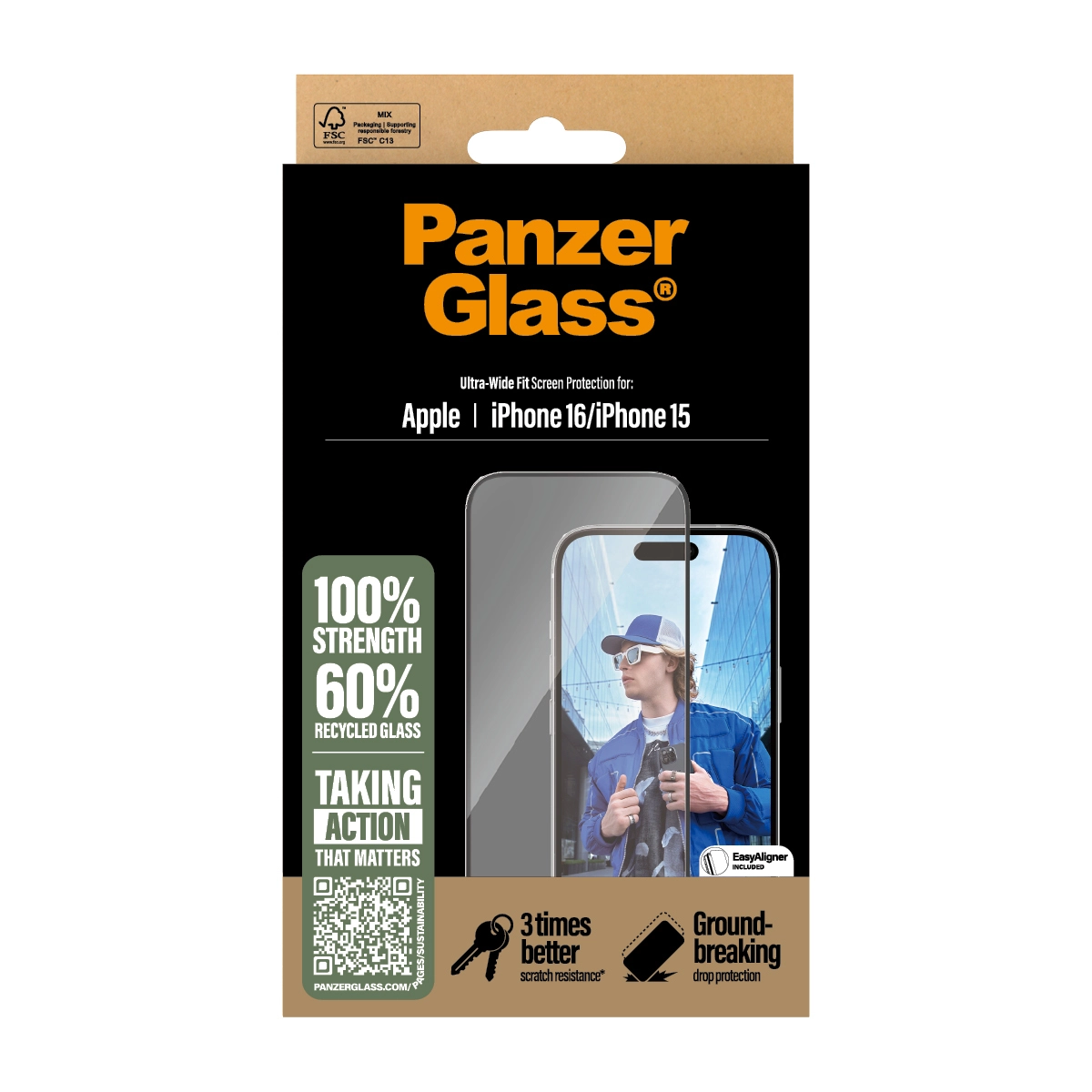 This screen protection prolongs the lifetime of your phone so that one day you can pass it on to someone else who will love it just as much as you do. It’s the new circle of phone life and one way of working toward a more sustainable future. Another is to use less packaging. In 2024, we reduced the amount of paper in our PanzerGlass® core product packaging design by an average of 66%*. And like all our products, it comes in a box made of recyclable FSC™-certified paper.