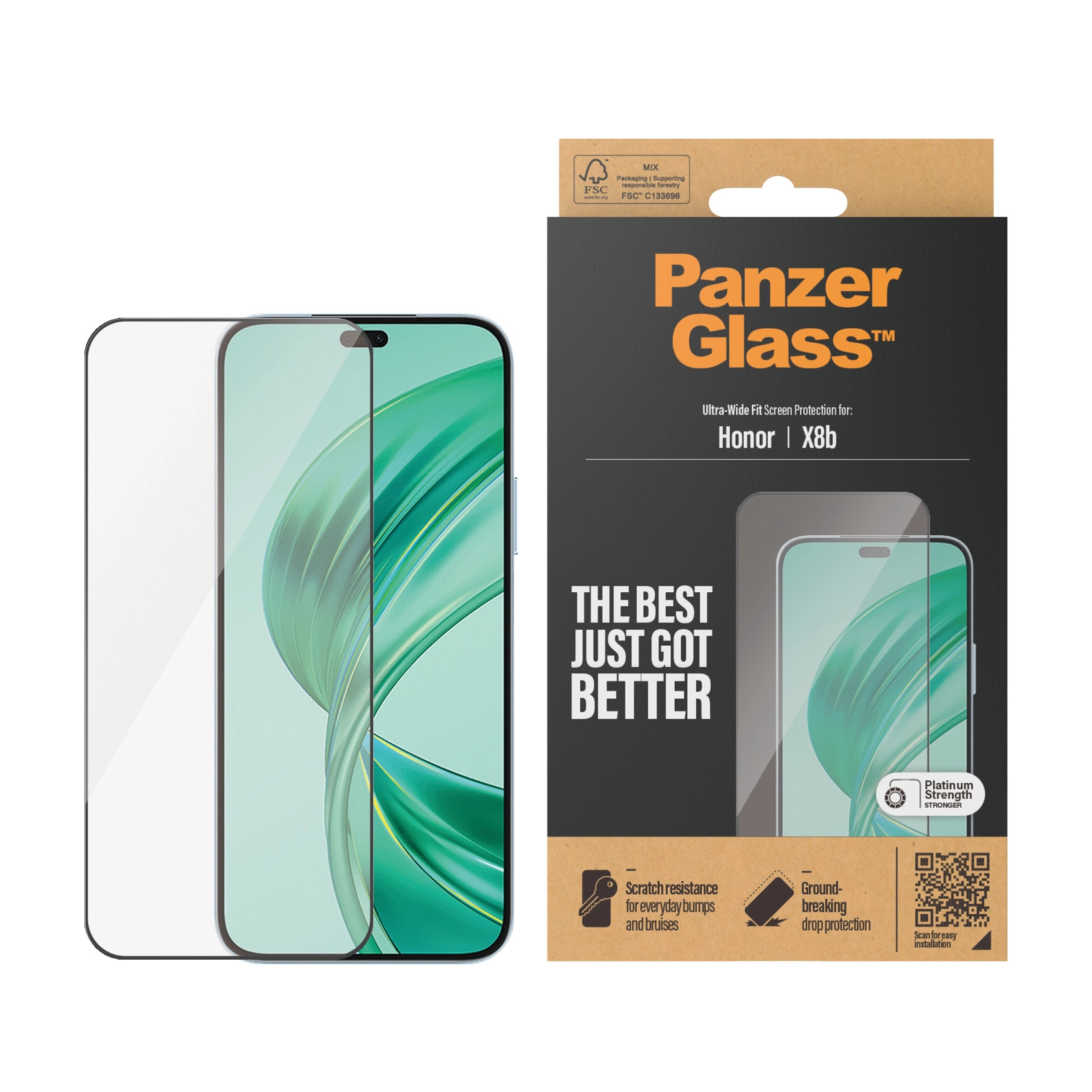 The screen protector is Ultra-Wide Fit, which means that it covers the front surface of your phone, providing a complete and crystal-clear view of your screen, while still leaving a little room around the edges for a PanzerGlass® case. If you want 360-degree phone protection, combine the screen protector and case with a PanzerGlass® PicturePerfect camera lens protector.