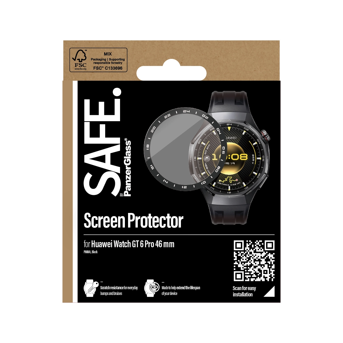 Protect your watch from the hazards of everyday life with a PanzerGlass® screen protector. Accidental bumps against handrails, table corners and other sharp-edged dangers are no match for its scratch and shock-resistant layers. The screen protector has even been drop-tested under 1 x Military Grade Standard conditions, which means it can withstand several drops from a height of 1.2 meters or a groping-around-in-the-dark-and-accidently-knocking-my-watch-off-the-bedside-table kind of height.    As an added bonus, the smudge-free coating reduces traces of fingerprints and dirt. The screen protector is easy to install – just click it on and off as you like – and once installed, you’ll never again fear the screeching sound of glass against metal. This may never happen, but if it does, you’ll regret not having clicked “add to cart”.    The full-body screen protector with black frame covers the entire front as well as the curved sides of your watch, while still providing easy access to all button controls, and it comes in FSC™-certified packaging that can be recycled.