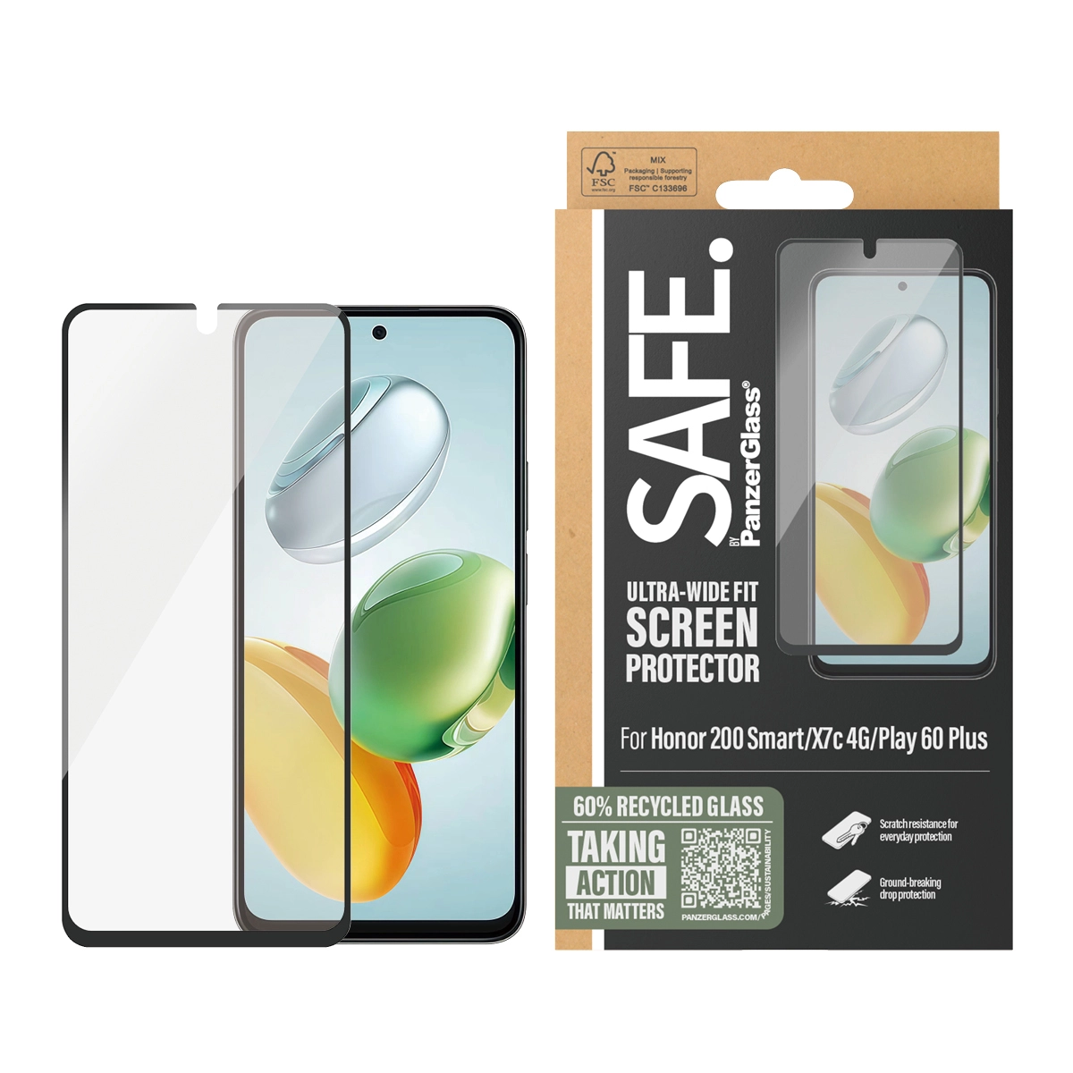 SAFE. is for real. SAFE. is for you. SAFE. is for dance floor mishaps, selfies gone wrong and your everyday fumbling, dropping and screen cracking. This SAFE. by PanzerGlass®️ screen protector made of 60% recycled material acts as a discrete airbag, protecting your phone by absorbing impacts and providing high-level scratch resistance without compromising the functionality and look of your device. It even has a smudge-free coating that reduces traces of fingerprints and grease.