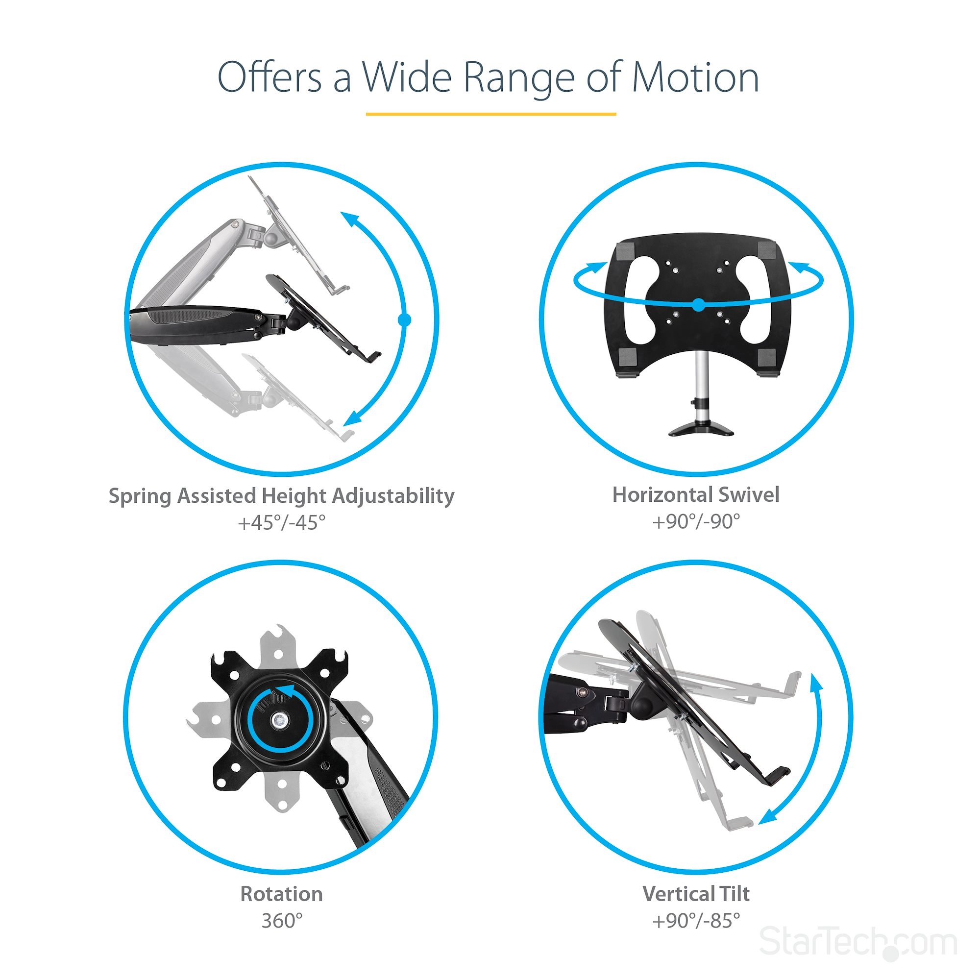 Monitor Arm with Laptop Tray | Up to 34" monitors & 8kg in weight | C-Clamp MountingThis Desktop Mount Laptop Arm enables you to raise your laptop off your desk and position it to increase ergonomics and productivity. Alternatively, you can mount a monitor up to 34" (16:9 or 21:9). The laptop/monitor arm supports up to 17.7lb / 8kg in weight, and it features cable management, one-touch/spring-assisted height adjustments along the 12.2" pole while extending up to a total height of 22" from the surface of the desk. Laptop and Monitor SupportThe laptop tray offers an area of 12.6"x9.5" to support your laptop up to 17.7lb/8kg, and it is fully adjustable to your viewing angle and height. When not using this arm as a laptop mount, you can mount monitors up to 34". The VESA mount offers a full range of motion that will adjust to your setup and ergonomics needs, When using it as a notebook mount, your laptop will need additional security at steeper angles (not included). Create an ergonomic setupThis full motion monitor arm lets you extend, tilt, and swivel your monitor and laptop with a full range of motion across multiple axes, with spring-assisted height adjustments for effortless positioning. It makes it easy to create an ergonomic work environment that's tailored to your specific needs. The monitor arm is perfect for smaller work environments, like cubicles, providing everything you need while using less space. Easy InstallationInstall this laptop/monitor arm along the edge of your desk, table or counter using the C-clamp that can be tightened by hand. And it supports desks with up to 3.3 in (8.5 cm) in thickness. ARMUNONB1 is backed by a StarTech. com 5-year warranty and free lifetime technical support. The StarTech. com Advantage