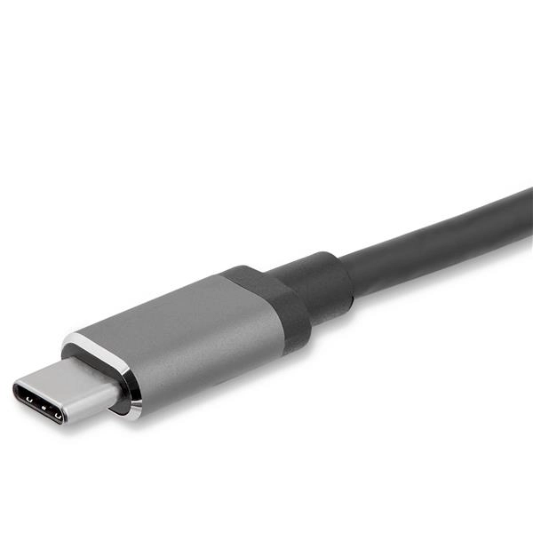 The HDMI output on this USB-C video adapter supports UHD resolutions up to 4K 30Hz, while the VGA output supports HD resolutions up to 1920 x 1200.