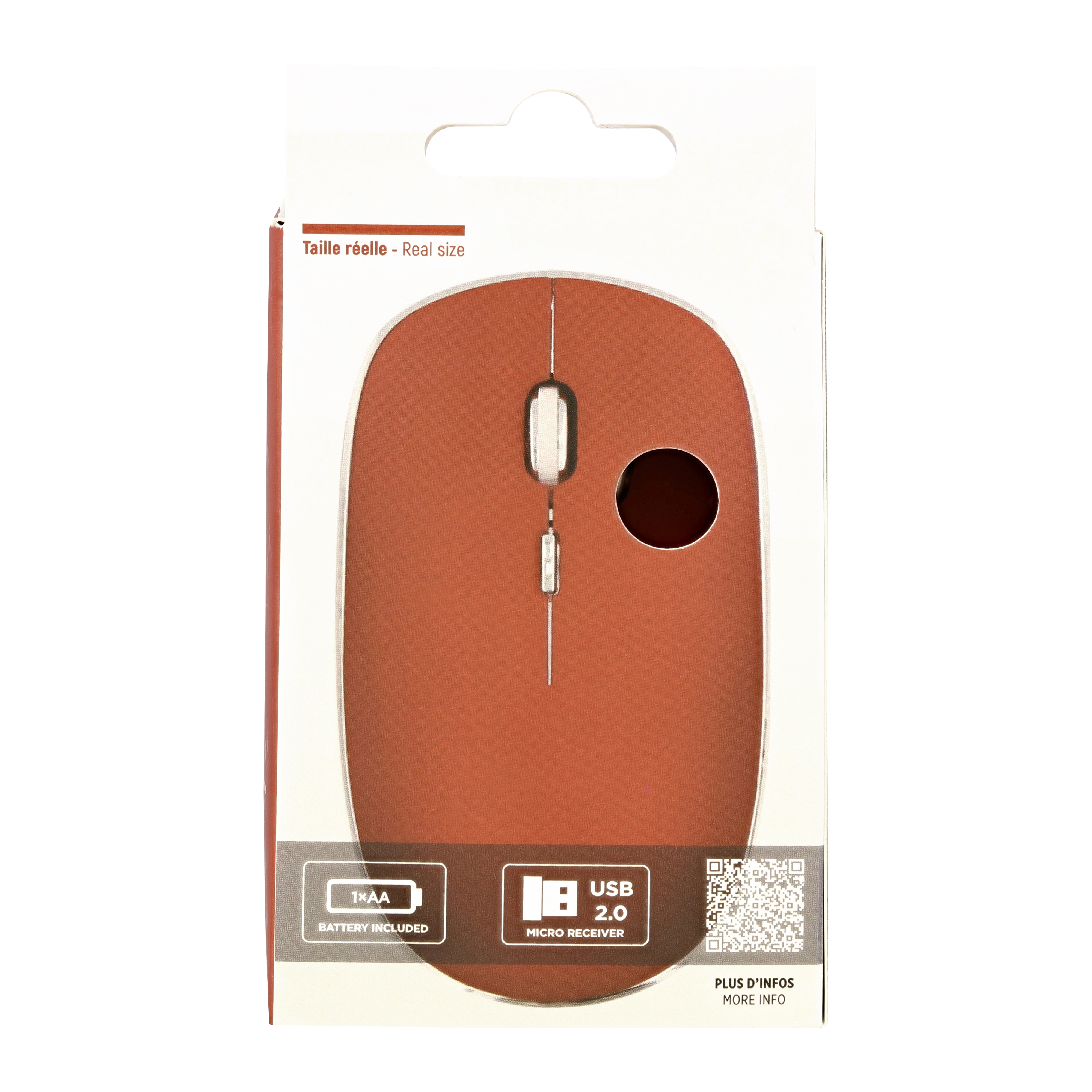 Wireless battery mouse with automatic sleep and ON/OFF button. Plug&Play, it connects automatically once the USB dongle is plugged into the computer. "Soft touch" coating. Silent click. Compact and modern design with a pleasant grip.
