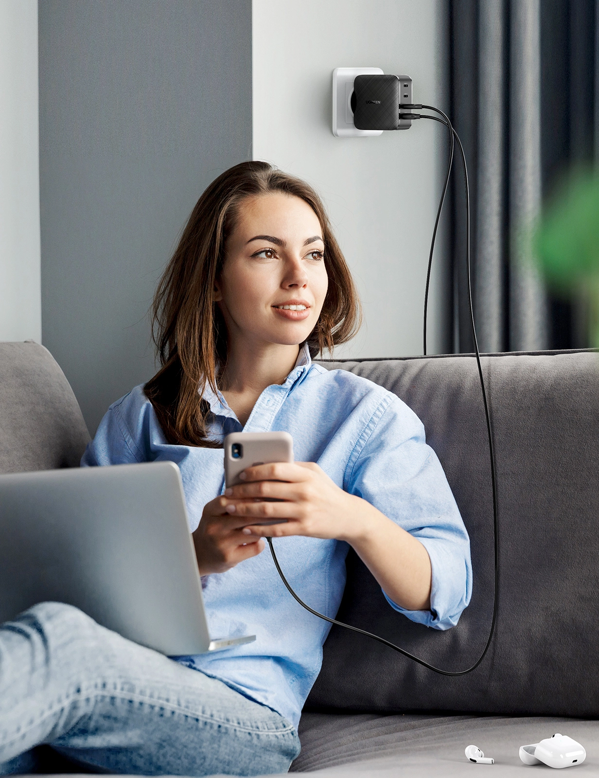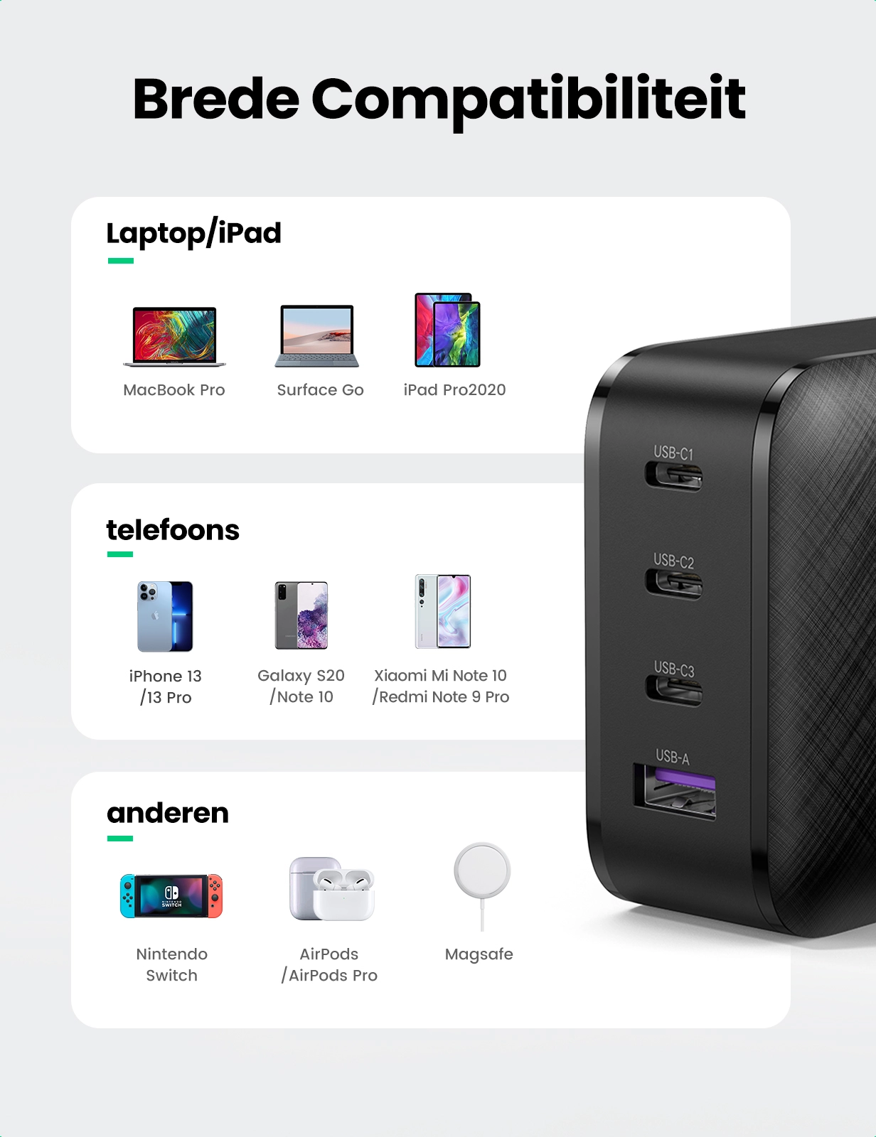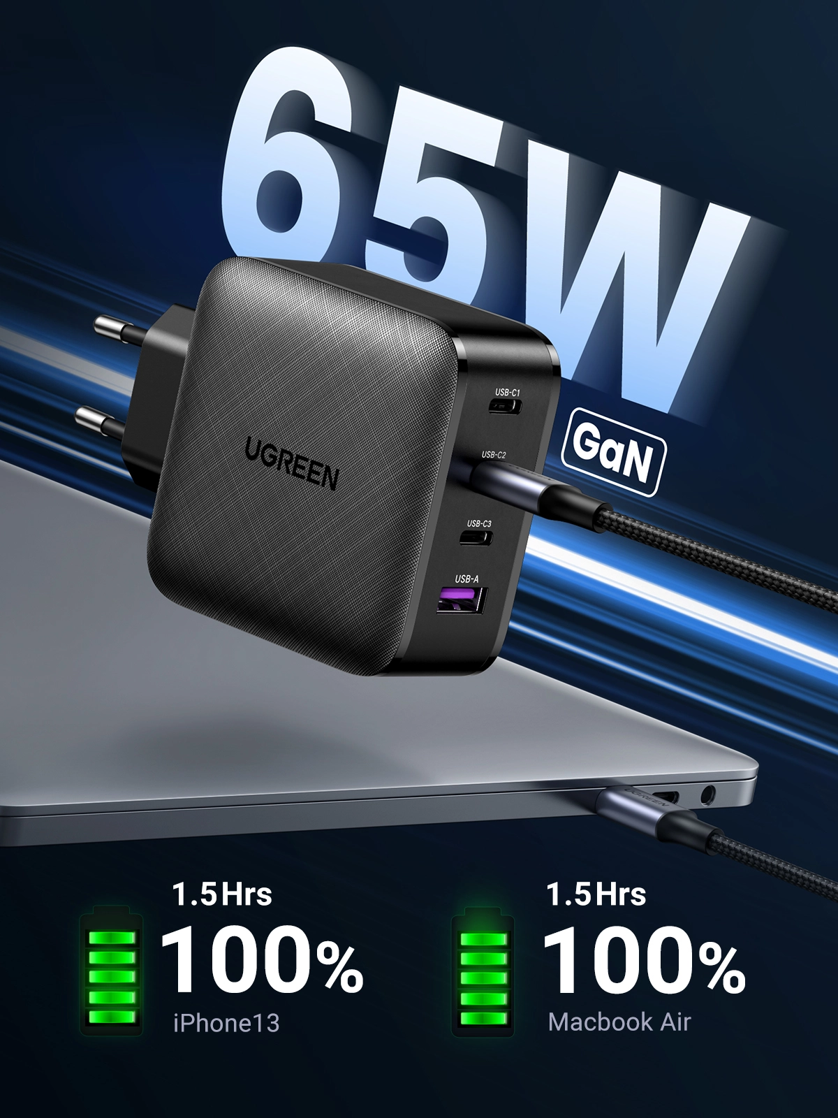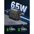 Charge 50% within 30 min for iPhone X, the UGREEN 65W GaN PD Charger features fast charging for iPhone 12, iPhone 12 Pro, iPhone 12 Mini, iPad Air 2020, iPad Pro 2020, Nintendo Switch and AirPods at the same time. The intelligent power management delivers optimal charging power to fast charge your devices.
