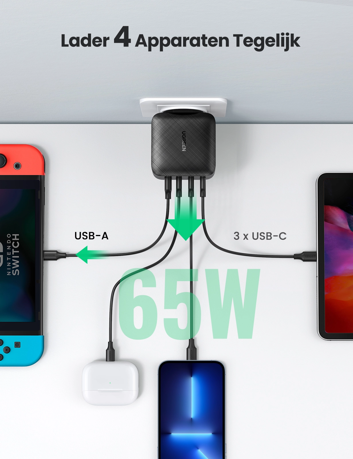 USB-A + 3xUSB-C 65W GaN Tech SnelOplader