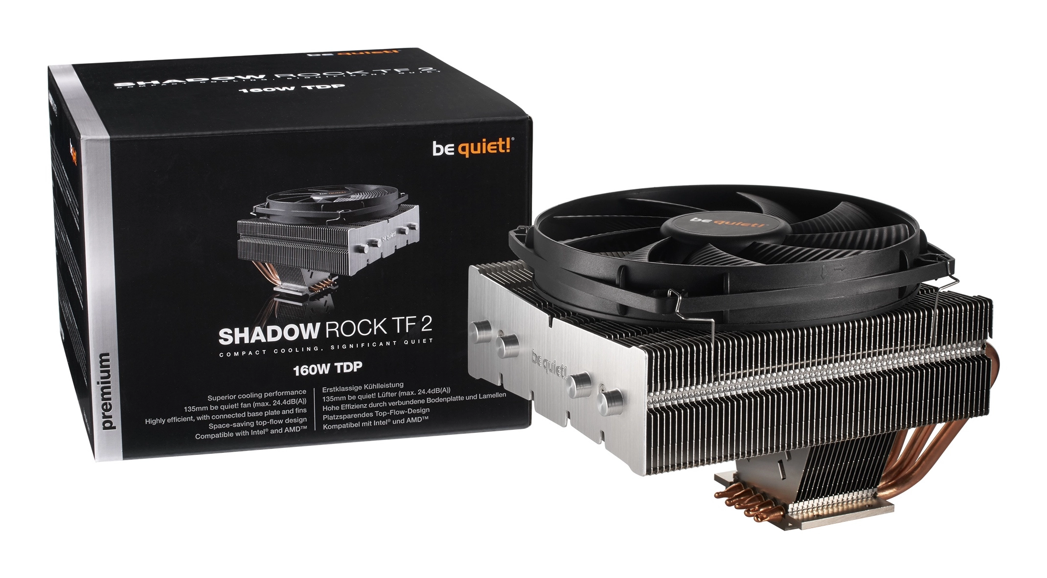 be quiet! Shadow Rock TF 2. Soort: Koeler, Ventilator diameter: 13, 5 cm, Rotatiesnelheid ( min): 1400 RPM, Rotatiesnelheid ( max): 2000 RPM, Luchtstroom: 113, 8 m³/uur, Maximum luchtdruk: 2, 1 mmH2O, Type lager: Ventilatorlager. Breedte: 137 mm, Diepte: 165 mm, Hoogte: 112 mm. Kleur van het product: Zwart, Koper, Zilver