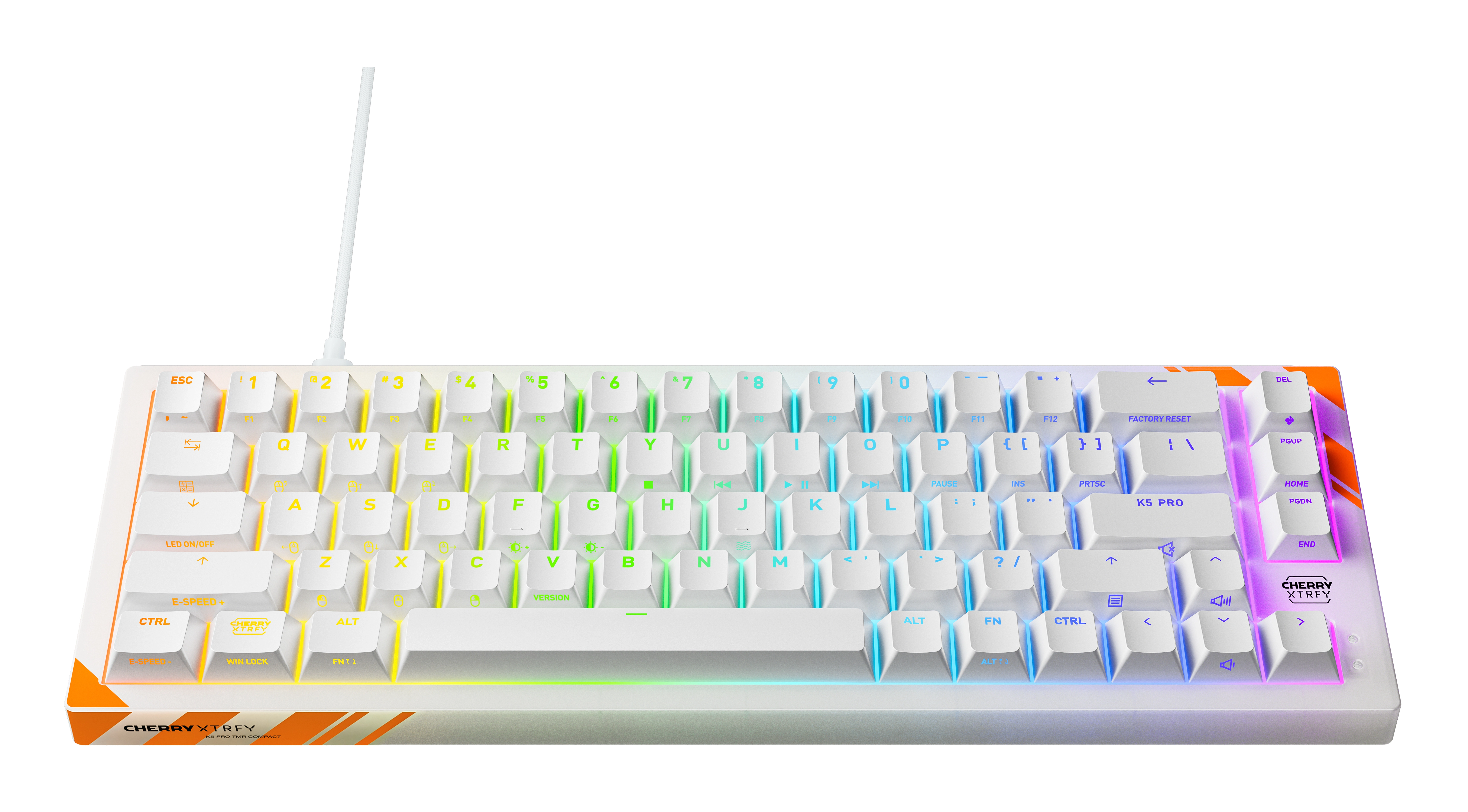 CHERRY K5 PRO TMR COMPACT. Toetsenbord formaat: 65%. Stijl toetsenbord: Recht. Connectiviteitstechnologie: Bedraad, Aansluiting: USB, Toetsenbord toetsschakelaar: Mechanische keyswitch, Toetsenbordindeling: QWERTY. Backlight type: RGB LED. Snoerlengte: 2 m. Aanbevolen gebruik: Gamen. Kleur van het product: Oranje, Wit