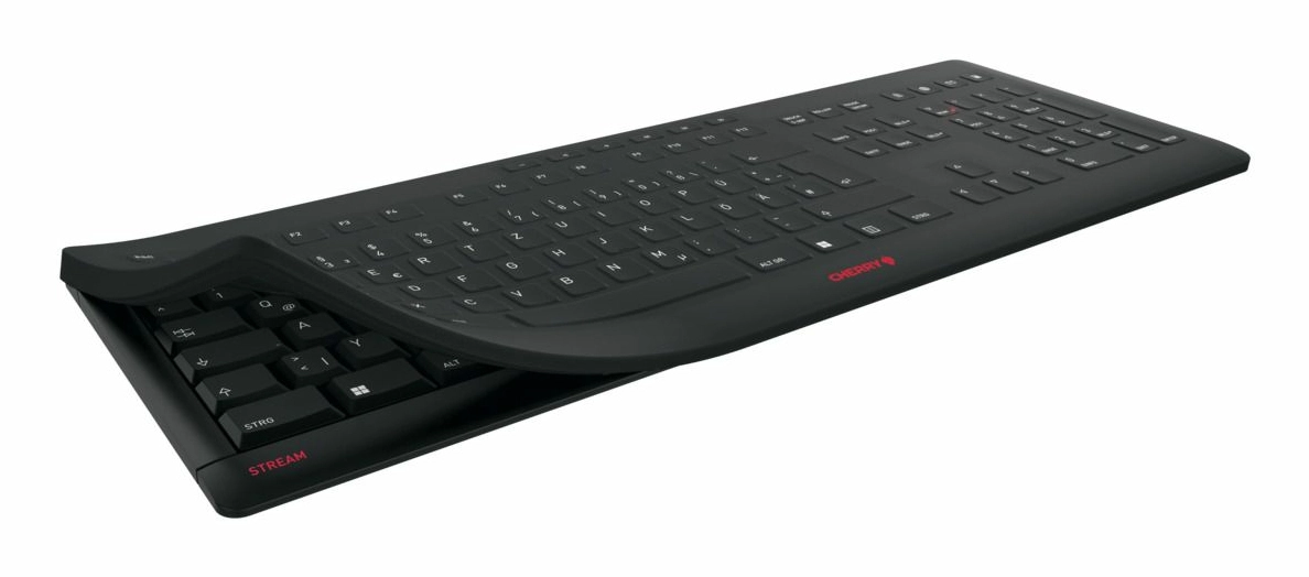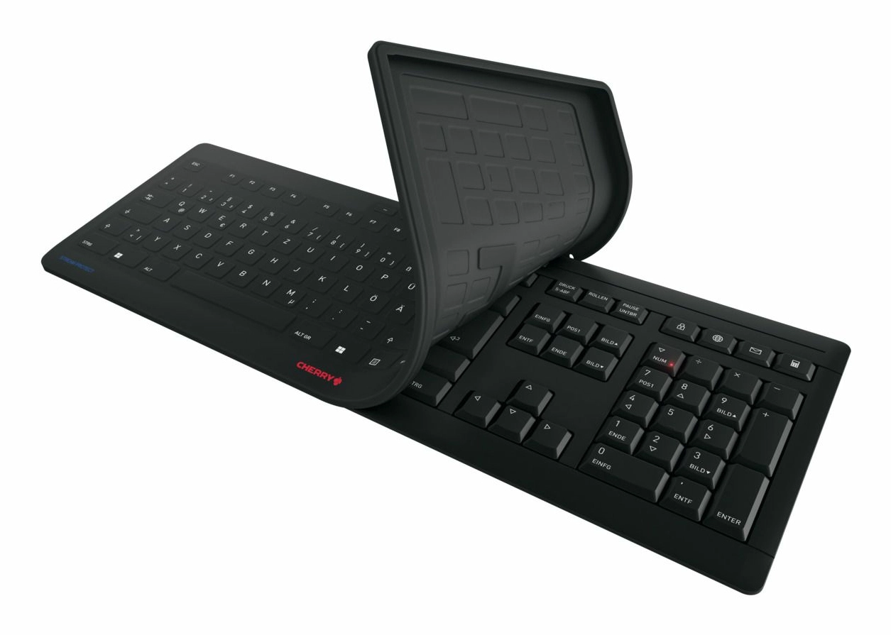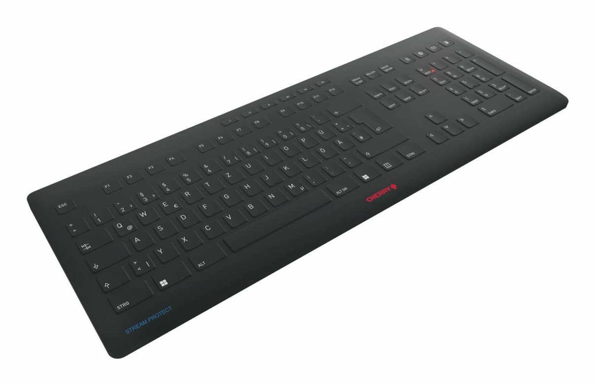 Het CHERRY STREAM KEYBOARD wordt met de CHERRY STREAM PROTECT MEMBRAAN een CHERRY STREAM PROTECT KEYBOARD. Het toetsenbord kan door wissen volledig worden gereinigd en zelfs gedesinfecteerd, met uitstekend schrijfcomfort. CHERRY en ACTIVE KEY – twee succesverhalen brengen beproefde kwaliteit en hygiënische veiligheid perfect met elkaar in overeenstemming. CHERRY staat voor compromisloze betrouwbaarheid, duurzaamheid en het hoogste invoercomfort bij dagelijks gebruik. CHERRY STREAM-toetsenborden bewijzen miljoenen keren hun betrouwbaarheid, niet alleen op het werk. Uur voor uur, dag na dag. ACTIVE KEY is als toonaangevende aanbieder van hygiëne-invoerapparaten uiterst competent. De speciale leverancier van het Cherry-concern ontwikkelt nauwkeurig passende en robuuste siliconenmembranen voor de hoogste hygiënenormen in klinische toepassingen. Met de STREAM PROTECT MEMBRANE van Active Key kunnen miljoenen gebruikers van het STREAM KEYBOARD hun toetsenbord met een op maat gemaakt, hygiënisch toetsmembraan uitbreiden. Door veelvuldig gebruik en gebruik door verschillende personen worden toetsenborden een verzamelplaats voor vuil en kiemen. Op het CHERRY STREAM PROTECT KEYBOARD worden verontreinigingen en micro-organismen, zoals bacteriën en virussen, eenvoudig van het platte en volledig gesloten toetsenoppervlak gewist. Om te wisselen en afwassen wordt het toetsenmembraan van het toetsenbord vervangen. Zo beschermt het STREAM PROTECT MEMBRAAN effectief mens, toetsenbord en natuur. Het STREAM PROTECT KEYBOARD WIRELESS volgt het design, de elegantie en de puurheid van de CHERRY STREAM-productserie met de identiek slanke constructie, hoge torsiestijfheid en stabiliteit. Rubberen pads en uitklapbare voetjes zorgen voor de gebruikelijke vaste stand. Solide schaartechnologie en de geavanceerde haptiek aan het toetsenmembraan waarborgen het legendarische invoercomfort van de CHERRY STREAM-toetsenborden. Ongewijzigd betrouwbaar en ongecompliceerd is ook de 2, 4 GHz draadloze verbinding met een bereik van maximaal 10 meter. Het toetsenbord kan Plug & Play via de ontvanger met de pc worden verbonden. De draadloze verbinding beschikt over een AES-128-gegevenscodering. Geringe batterijstand wordt via de in de toetsen ingebouwde statusleds aangegeven. Het STREAM PROTECT MEMBRAAN biedt hygiënische bescherming overal waar al een CHERRY STREAM-toetsenbord wordt gebruikt, bijv. in het openbaar bestuur, in onderwijsinstellingen, scholen en universiteiten of in gemeenschappelijke kantooromgevingen/gedeelde kantoren.