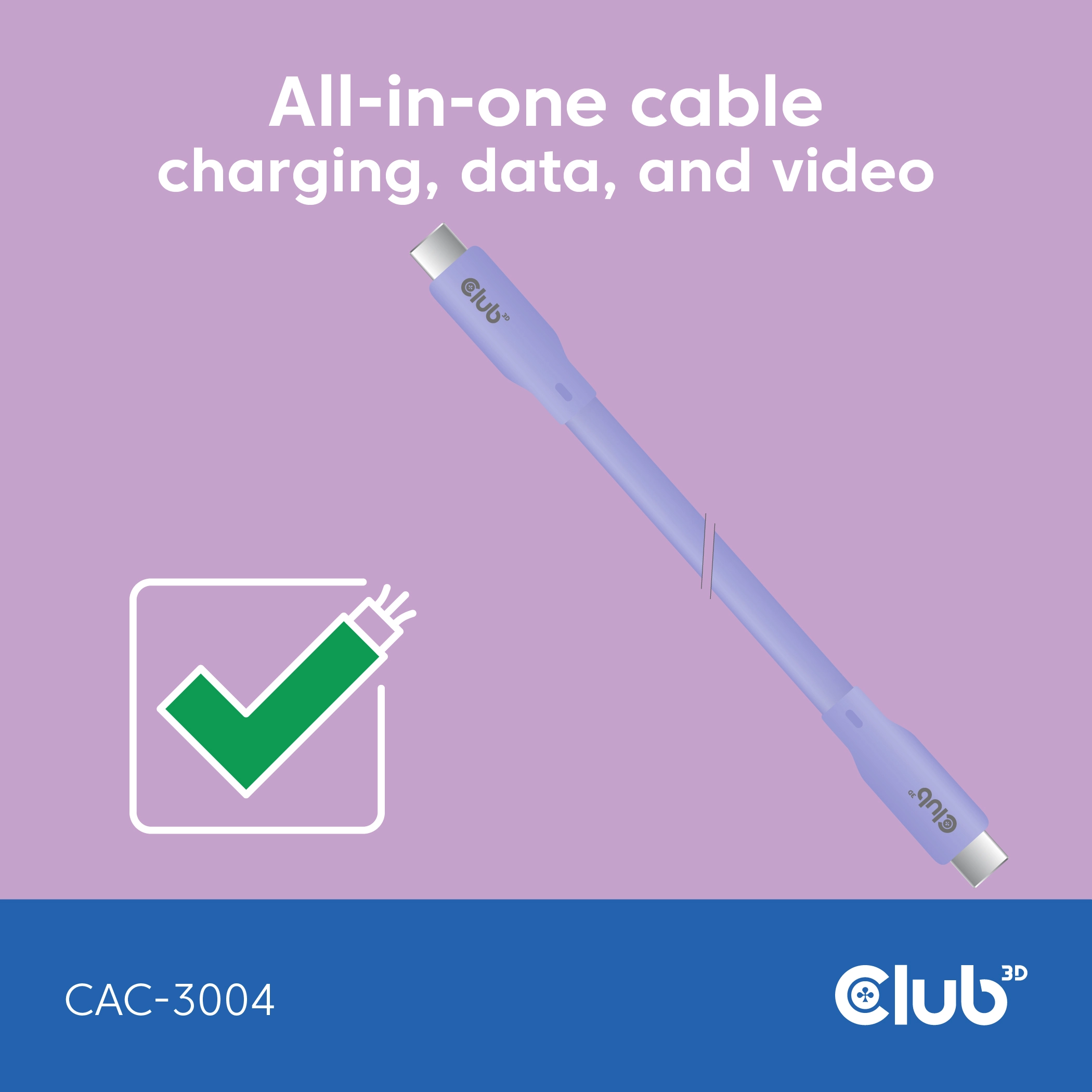CLUB3D USB C oplaadkabel paars siliconen & tangle-free. Snoerlengte: 2 m. Aansluiting 1: USB C, Aansluiting 2: USB C, USB-versie: USB4 Gen 2x2, Kleur van het product: Paars