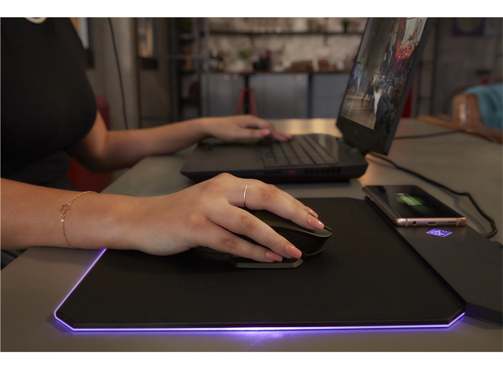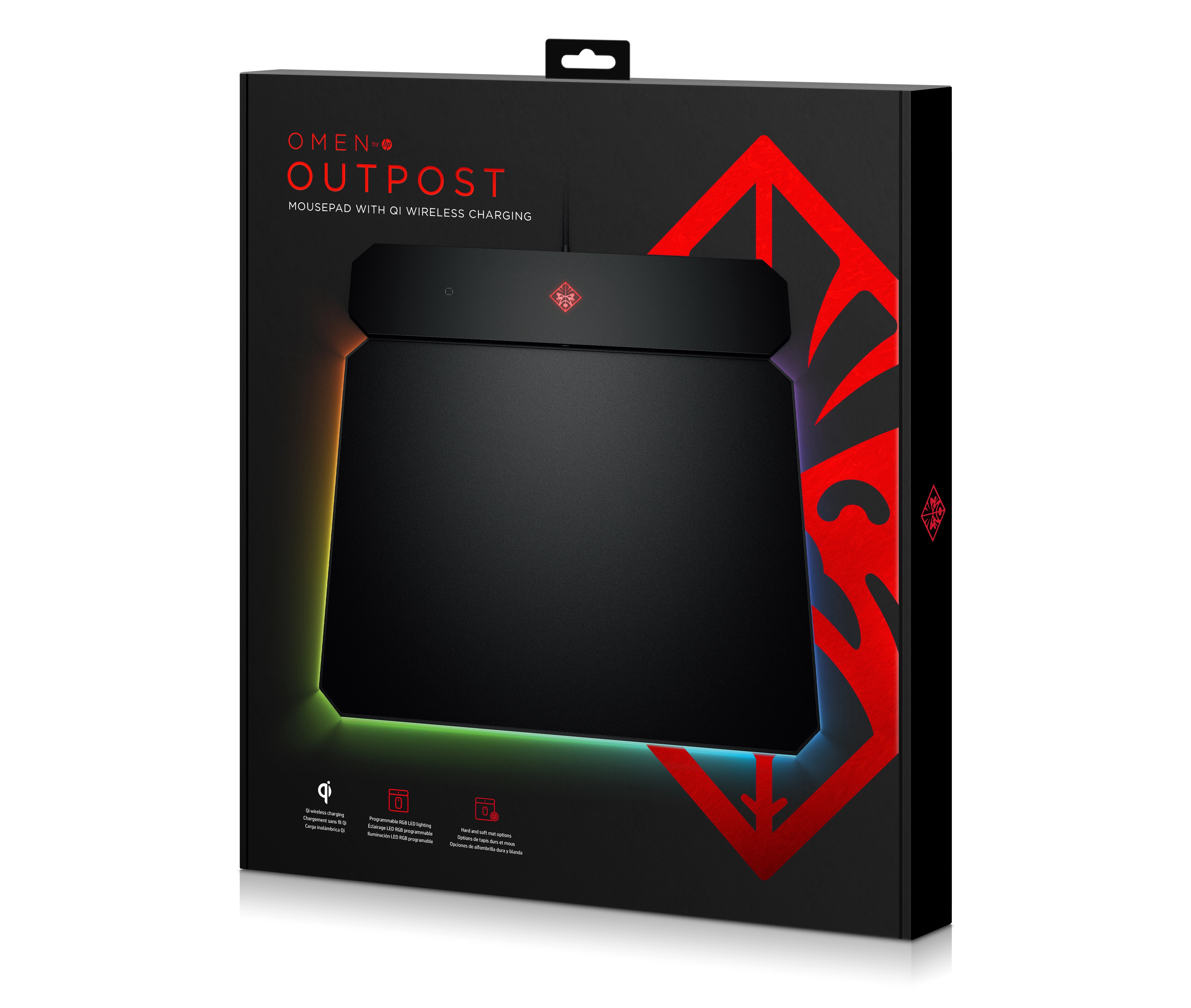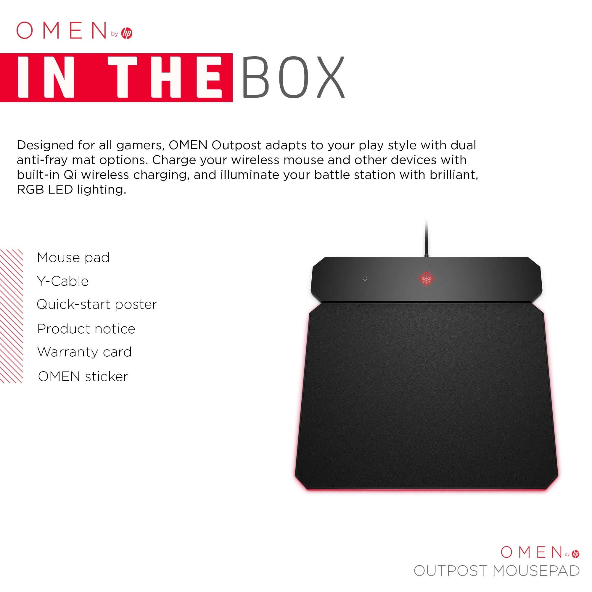 De OMEN Outpost past zich aan je speelstijl aan met een omkeerbare anti-rafelmuismat met een harde en zachte kant en is geschikt voor elke gamer. Laad je draadloze muis en andere apparaten op met het ingebouwde Qi voor draadloos opladen.
