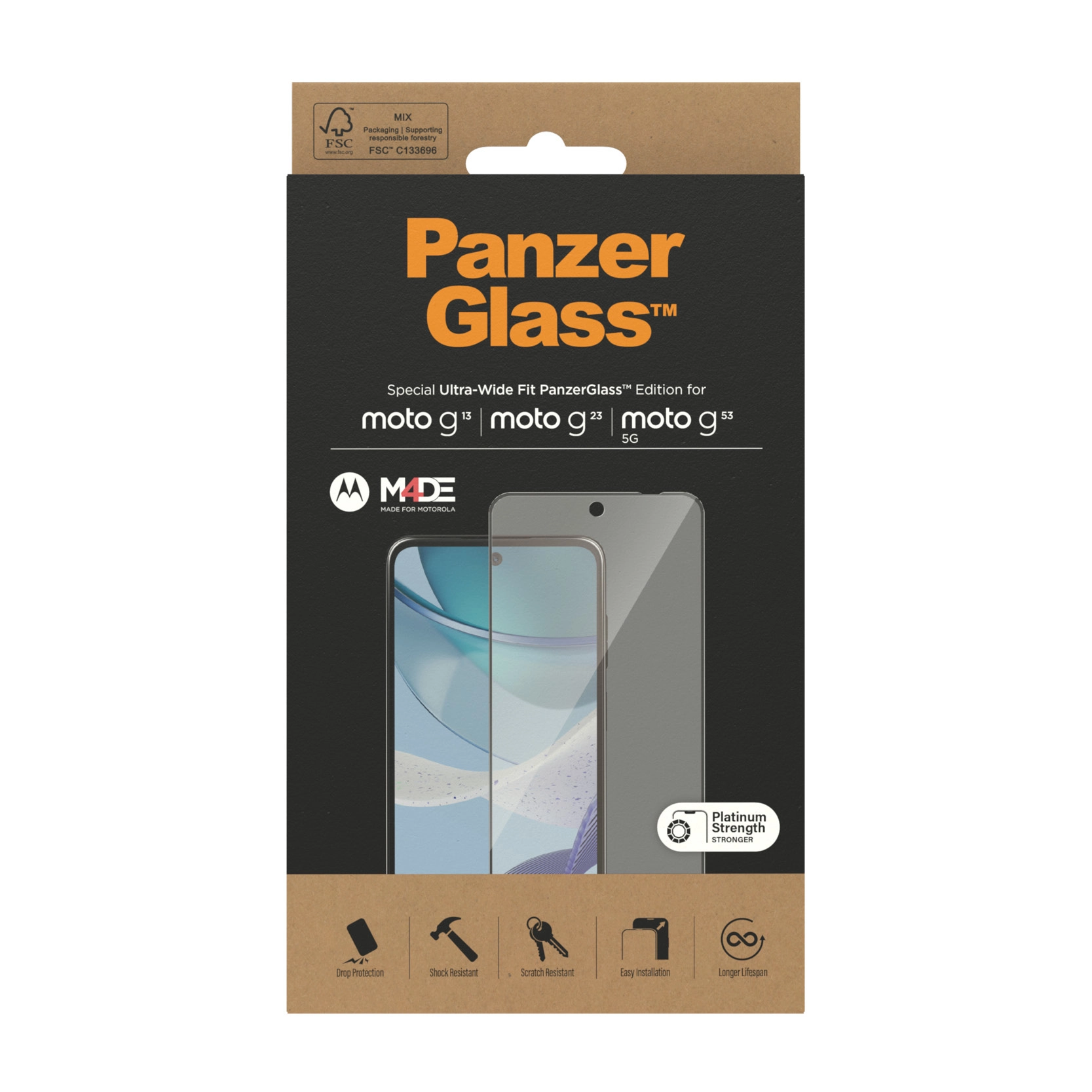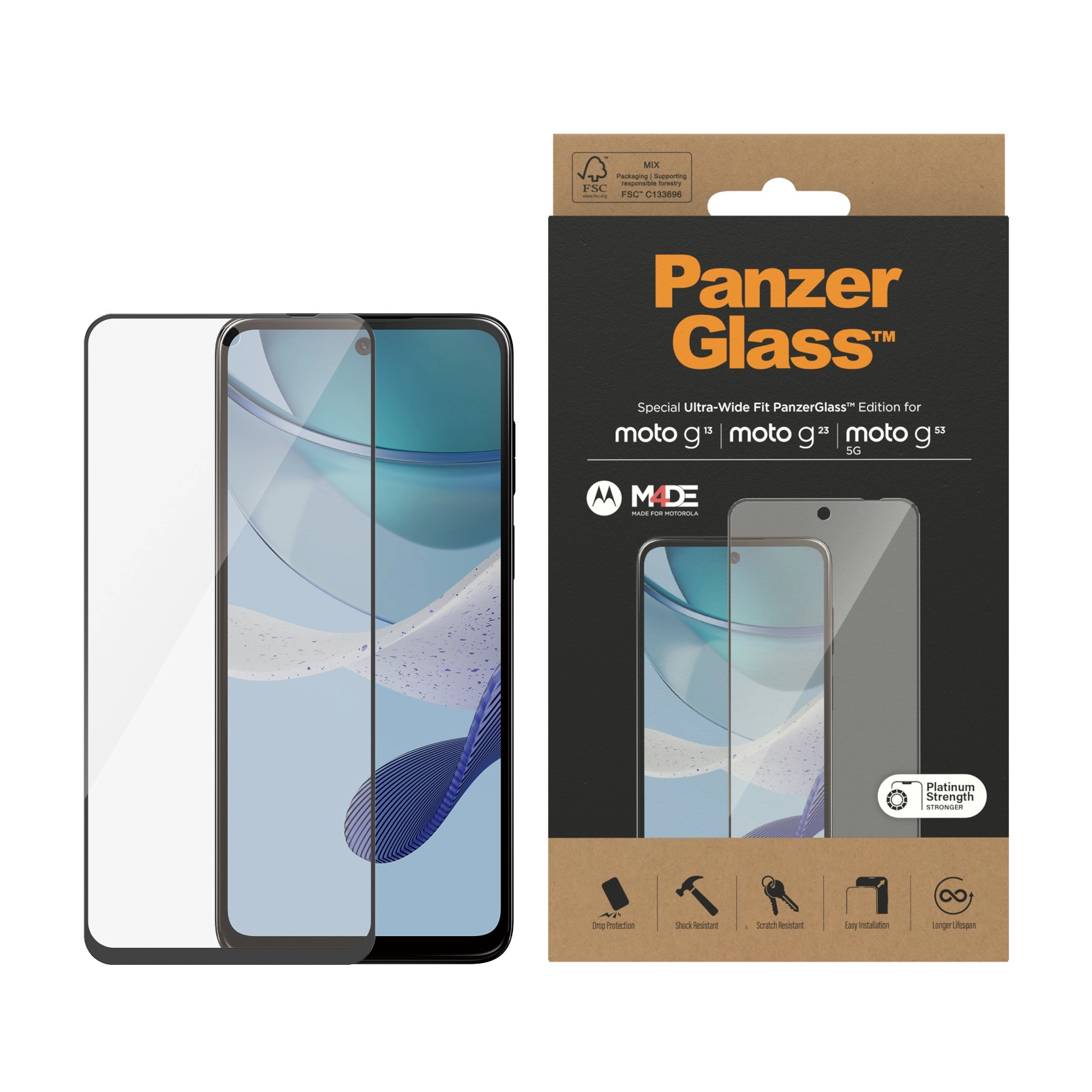 PanzerGlass 6572. Merkcompatibiliteit: Motorola, Compatibiliteit: Motorola - moto g13, Motorola - moto g23, Motorola - moto g53 5G. Droge toepassing. Veiligheidsfunties: Krasbestendig, Schokbestendig. Materiaal: Gehard glas, Polyethyleentereftalaat (PET), Silicone, Kleur van het product: Transparant. Aantal per verpakking: 1 stuk(s)