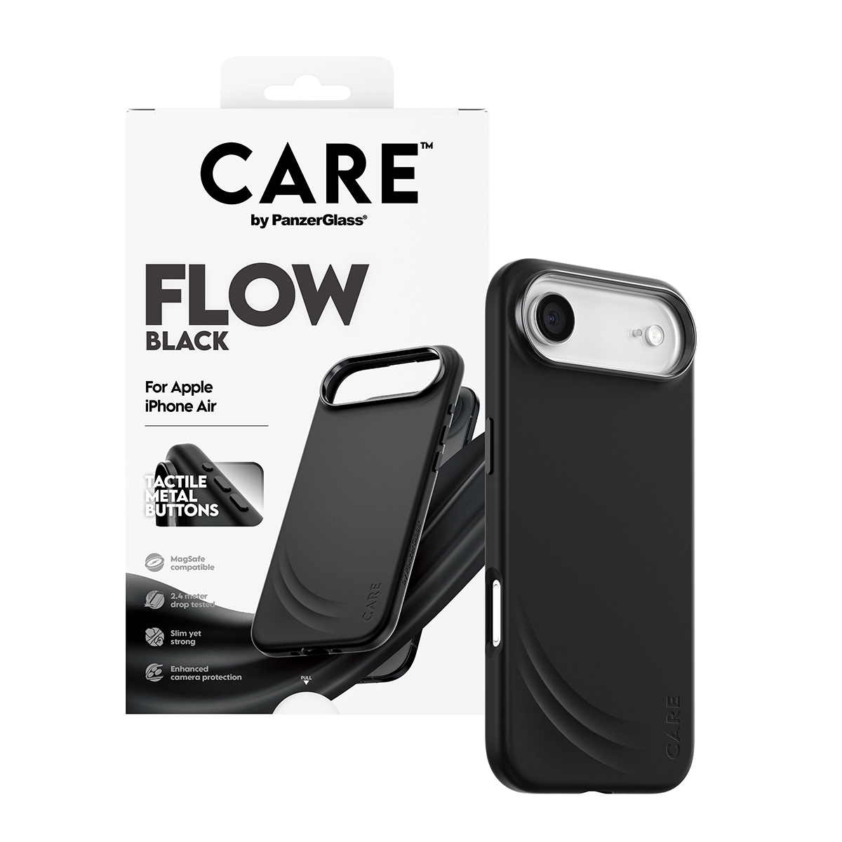 PanzerGlass CARE by ® Feature FLOW Case Black w. MagSafe iPhone Air. Type etui: Hoes, Merkcompatibiliteit: Apple, Compatibiliteit: Apple - iPhone Air, Oppervlakte kleur: Monochromatisch, Kleur van het product: Zwart