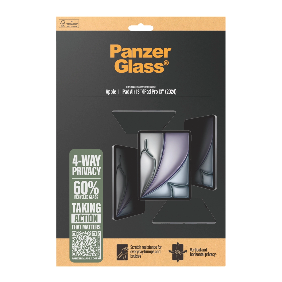 PanzerGlass ® 4-Way Privacy Screen Protector iPad Air 13" (2024-2025) | iPad 13" Pro (2024-2025) | Ultra-Wide Fit. Merkcompatibiliteit: Apple, Compatibiliteit: Apple - iPad Pro 13'' (2024), Apple - iPad Air 13" (2025). Droge toepassing. Veiligheidsfunties: Krasbestendig, Schokbestendig. Filterfunctie privacy, Materiaal: Gehard glas, Polyethyleentereftalaat (PET), Silicone, Kleur van het product: Transparant. Aantal per verpakking: 1 stuk(s)