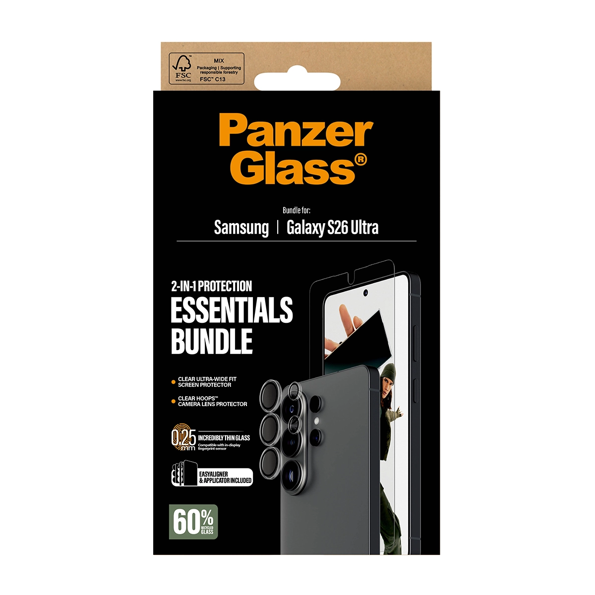 PanzerGlass ® Hoops® 2-in-1 Bundle Samsung Galaxy S26 Ultra | Ultra-Wide Fit. Merkcompatibiliteit: Samsung, Compatibiliteit: Samsung - Galaxy S26 Ultra. Droge toepassing. Veiligheidsfunties: Krasbestendig, Schokbestendig. Materiaal: Gehard glas, Silicone, Polyethyleentereftalaat (PET), Kleur van het product: Transparant. Aantal per verpakking: 1 stuk(s)
