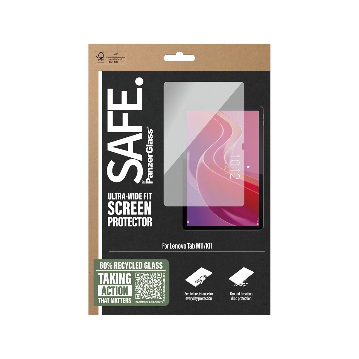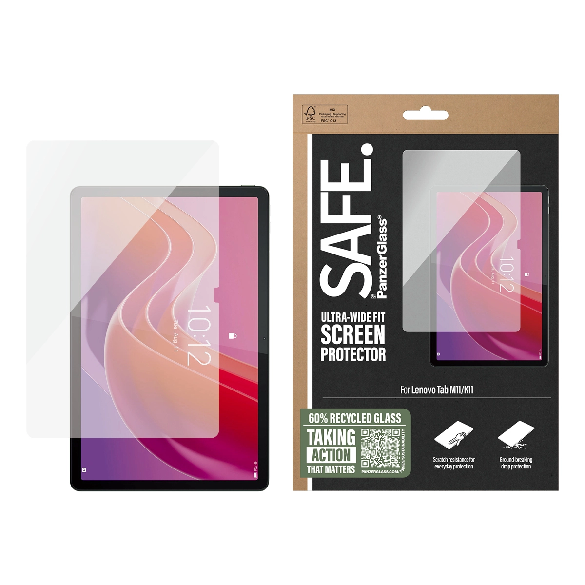 PanzerGlass SAFE95548. Merkcompatibiliteit: Lenovo, Compatibiliteit: Lenovo - Tab K11, Lenovo - Tab M11. Droge toepassing. Veiligheidsfunties: Krasbestendig, Schokbestendig. Materiaal: Gehard glas, Polyethyleentereftalaat (PET), Silicone, Kleur van het product: Transparant. Aantal per verpakking: 1 stuk(s)