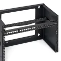 De stalen behuizing heeft een zwarte gepoedercoate afwerking voor krasbestendigheid en langdurige duurzaamheid. Een geïntegreerde kabelmanagementbalk met bevestigingsslots vermindert de kabelbelasting en zorgt voor een opgeruimde opstelling, waardoor de passieve luchtstroom wordt verbeterd en de toegankelijkheid bij probleemoplossing wordt vergemakkelijkt.