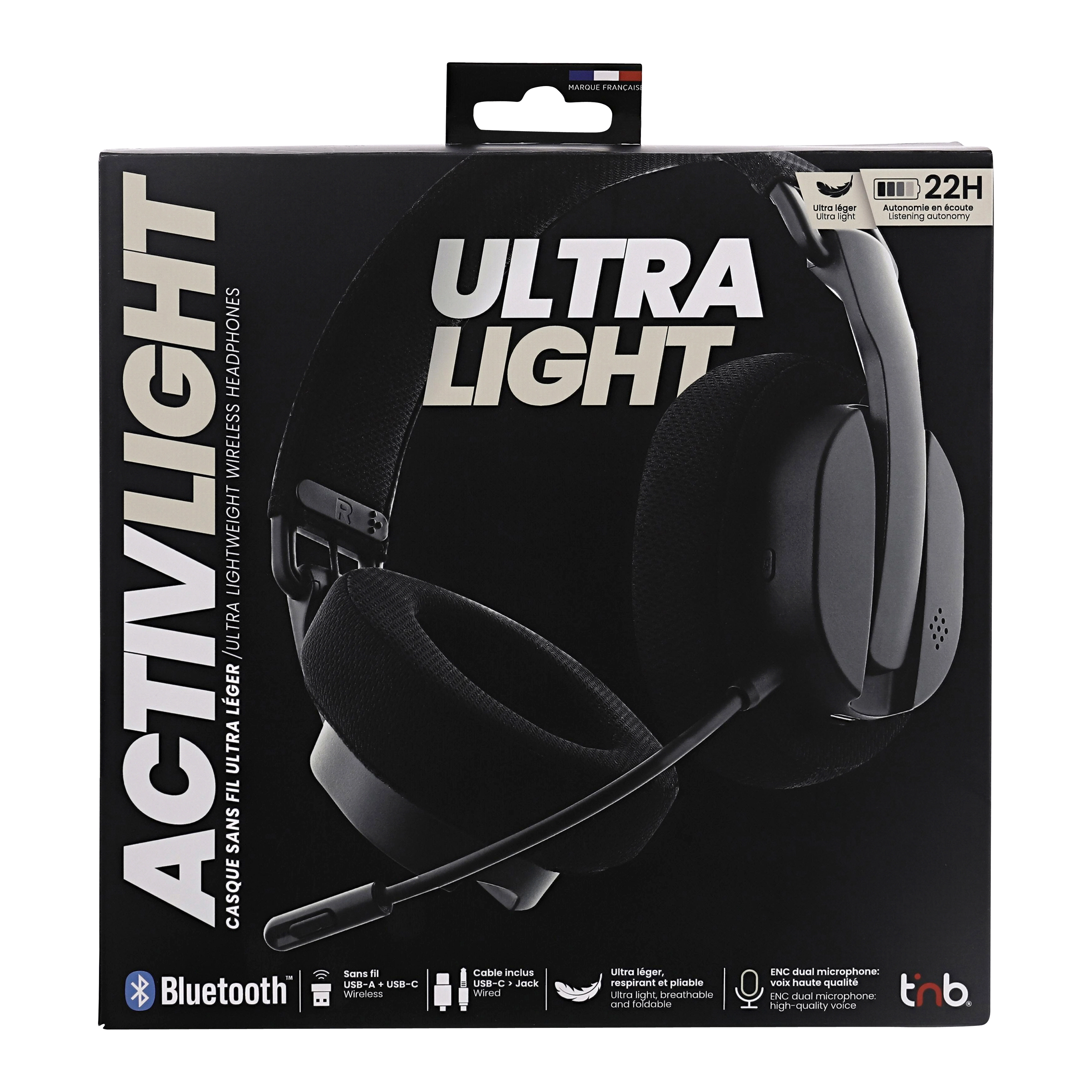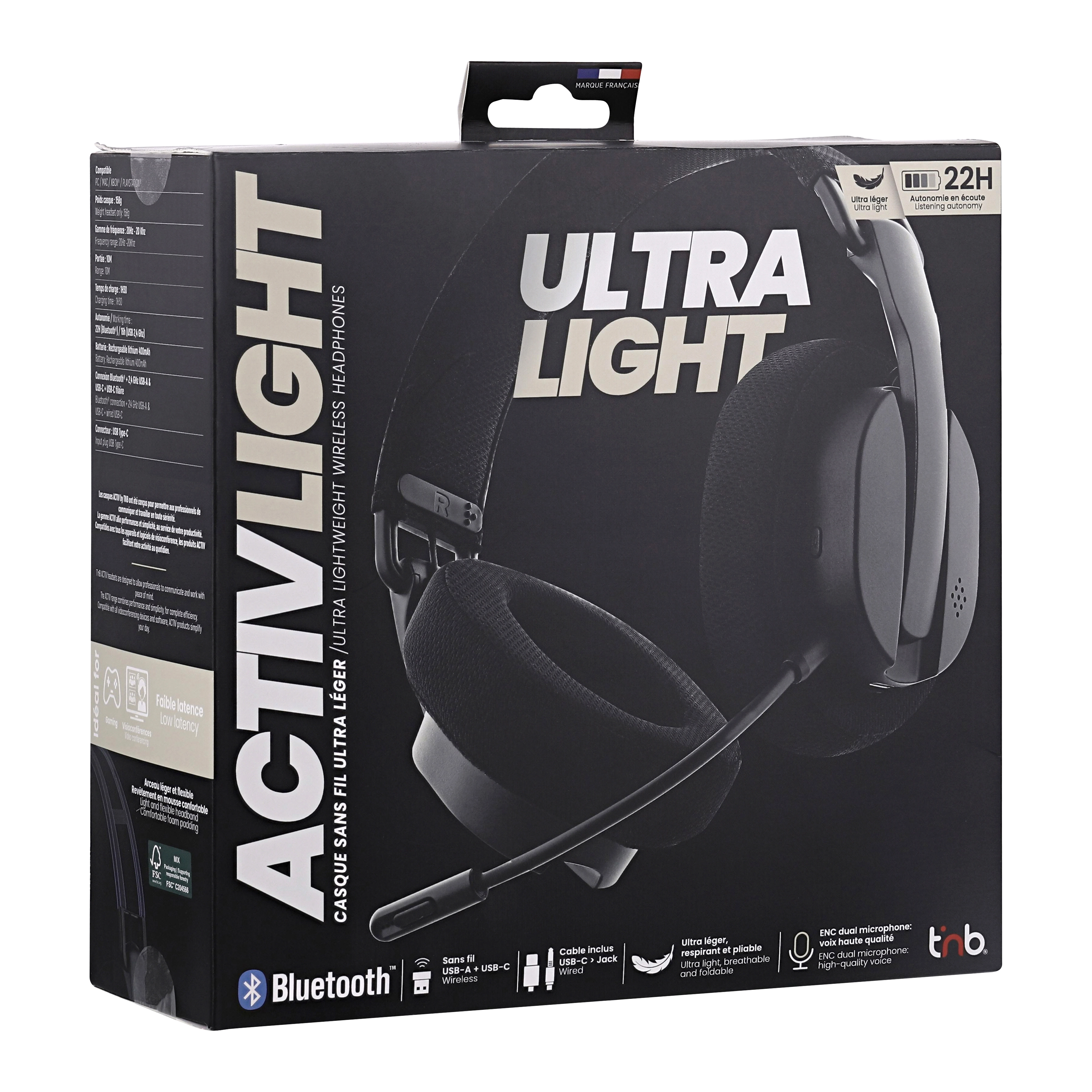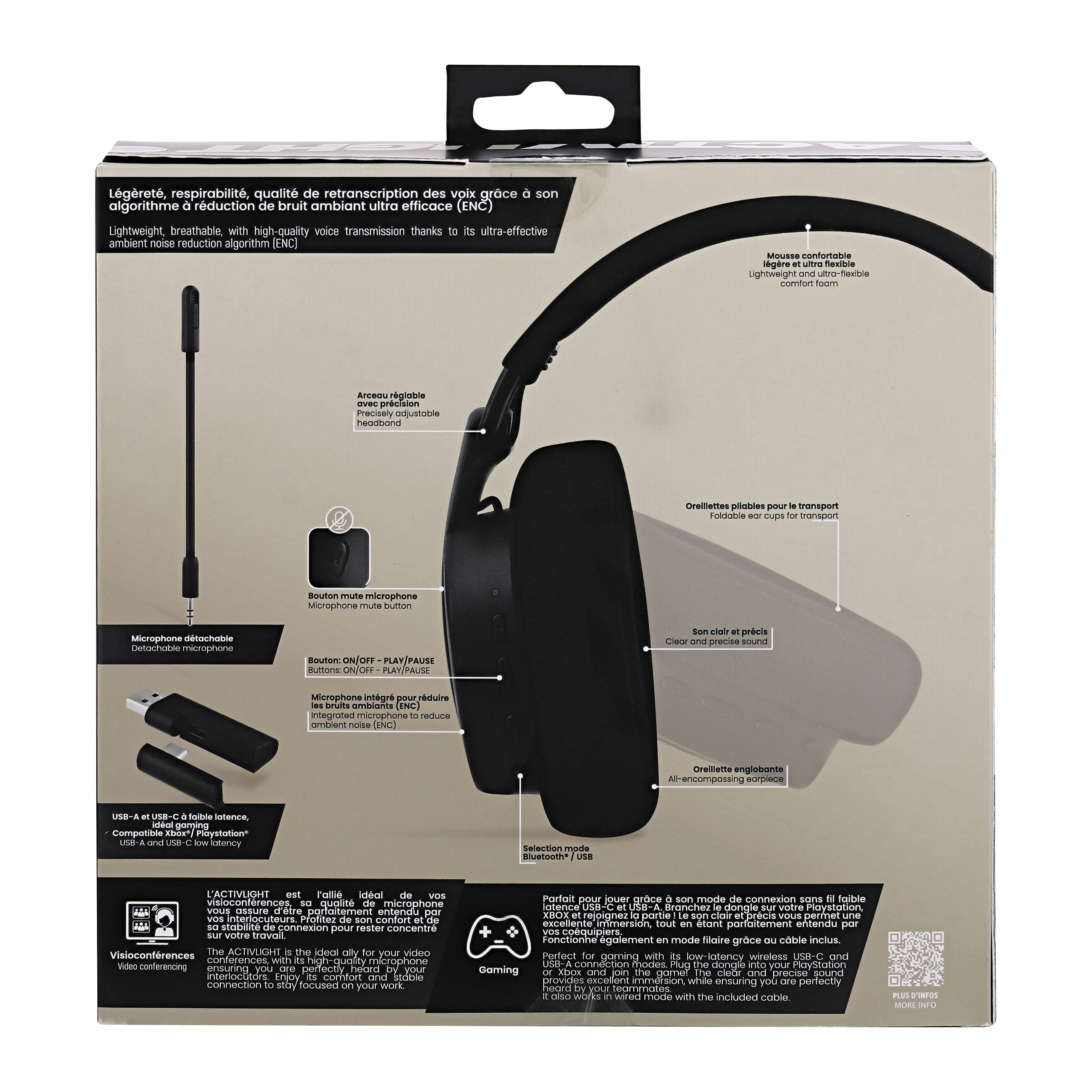 The ultra-lightweight ACTIVLIGHT wireless headset has been designed to provide a comfortable audio experience for all your uses, whether for gaming, calls or listening to music. Weighing only 158g, the ACTIVLIGHT is perfect for extended use, video conferencing or gaming. Enjoy the flexibility of 2.4GHz connectivity via USB-A and USB-C, Bluetooth and 3.5mm jack, allowing you to easily switch between different devices. Equipped with two microphones for external noise reduction (ENC), this headset guarantees clear voice capture, ideal for online gaming and calls to be perfectly heard by iPhone users with the Siri activation shortcut. The 400mAh rechargeable battery offers long-lasting battery life, allowing you to enjoy your music or games without interruption. The foldable design of the headset makes it easy to carry and store, perfect for travel. Detachable microphone. This headset is the essential accessory for all gaming and music lovers looking for comfort, sound quality and versatility.