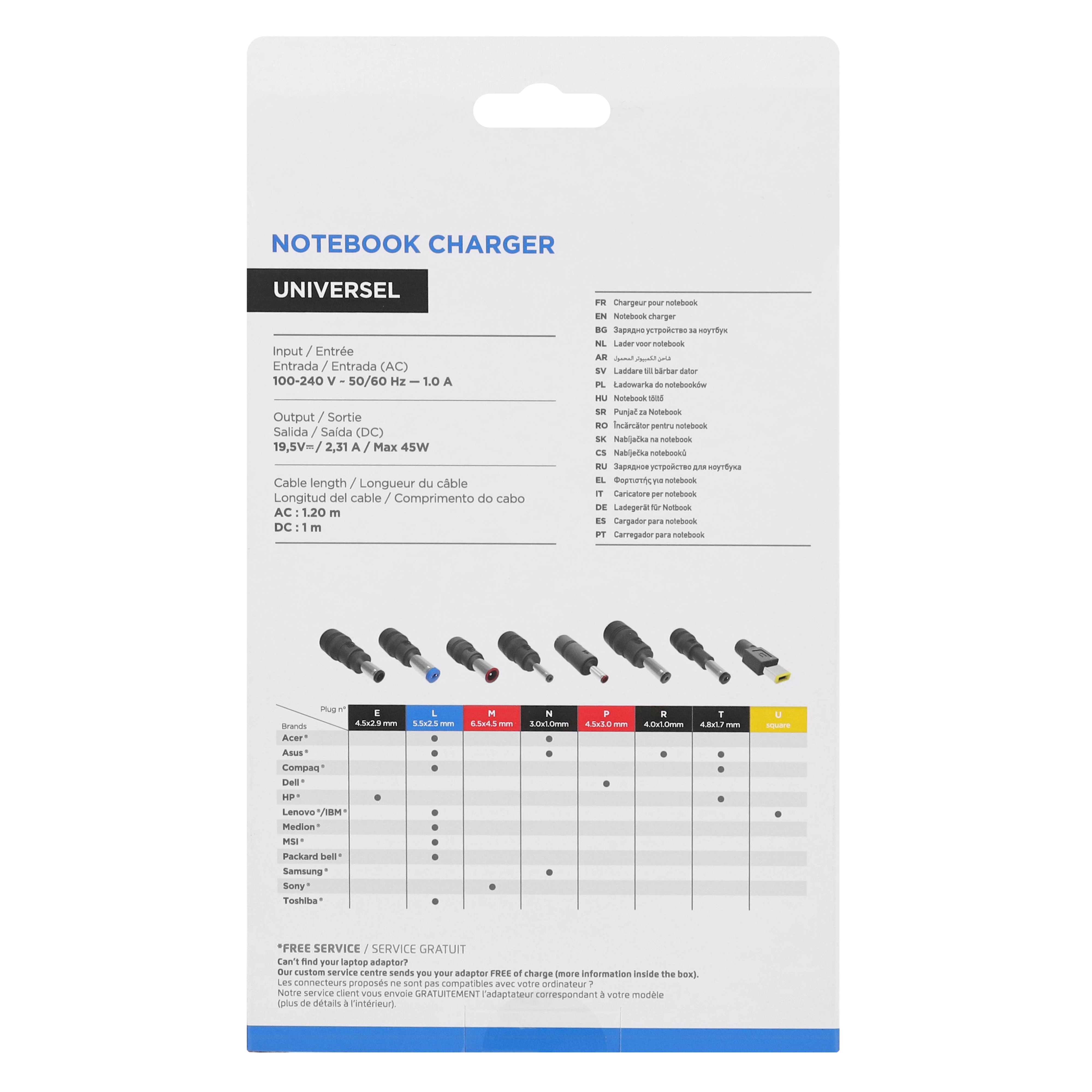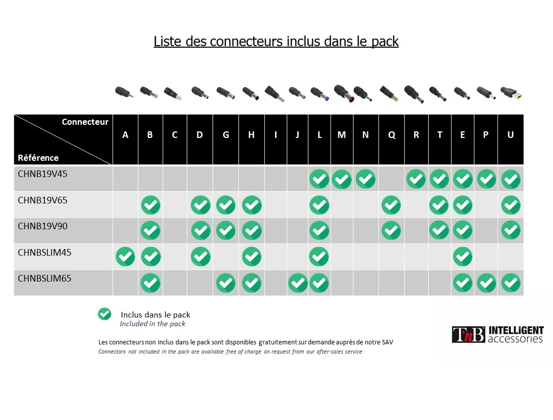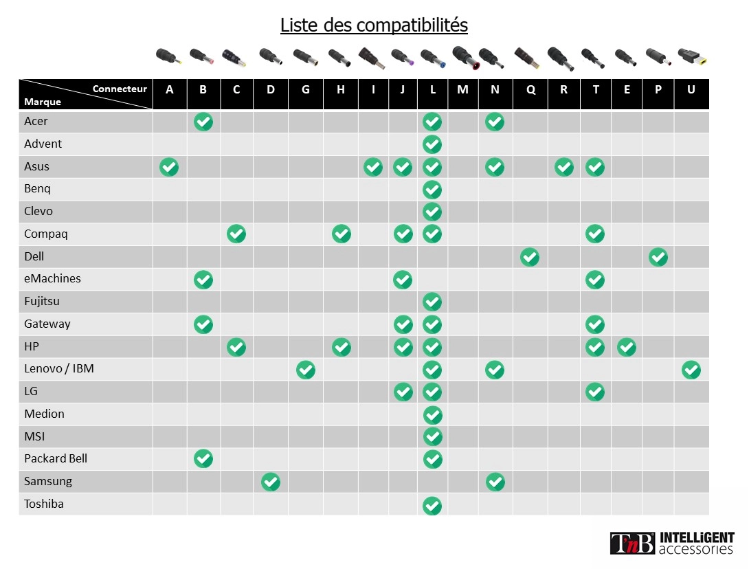 This charger delivers stable and secure power identical to your original power supply. Its eco-design ensures excellent energy performance. The many connectors provided ensure compatibility with major brands: Asus, Acer, Asus, Dell, HP, Lenovo, Packard Bell, MSI. . . . Other connectors are available from our after-sales service. For PCs up to 15i.