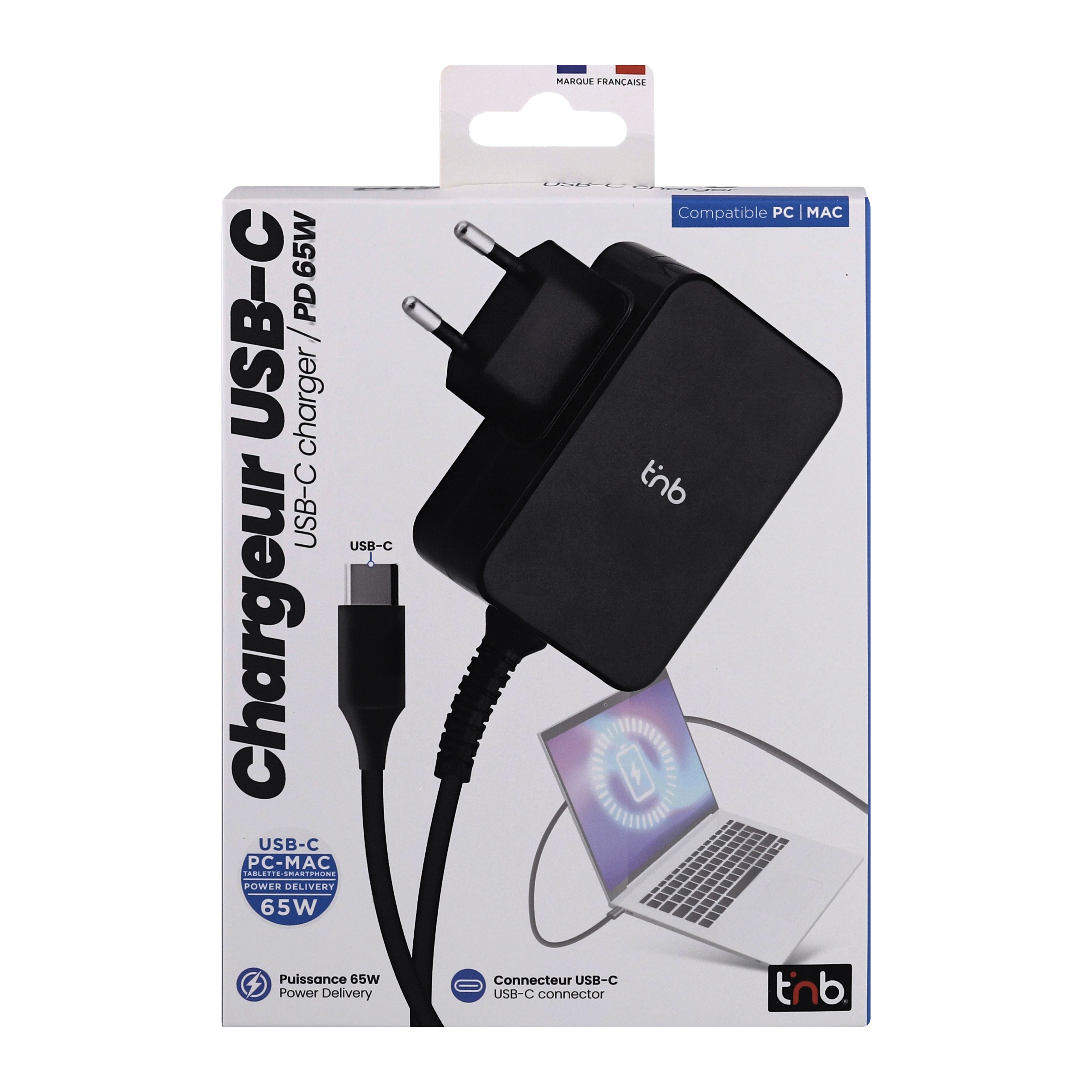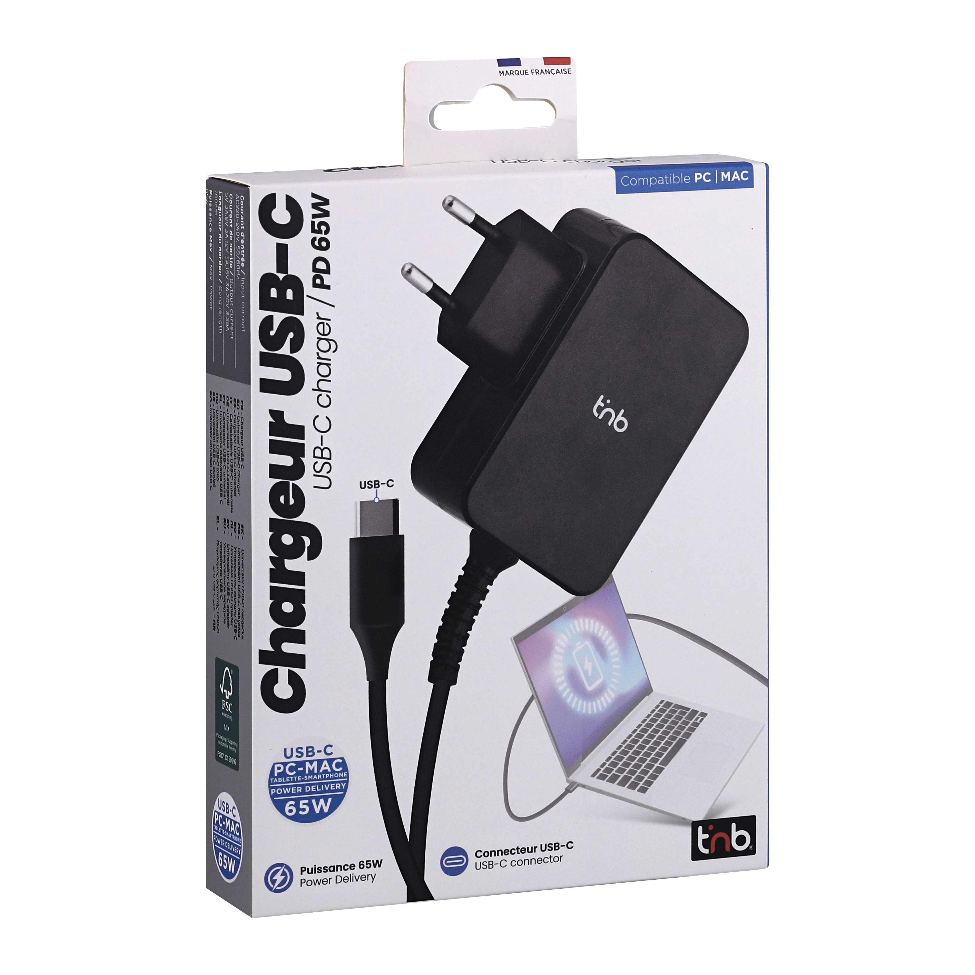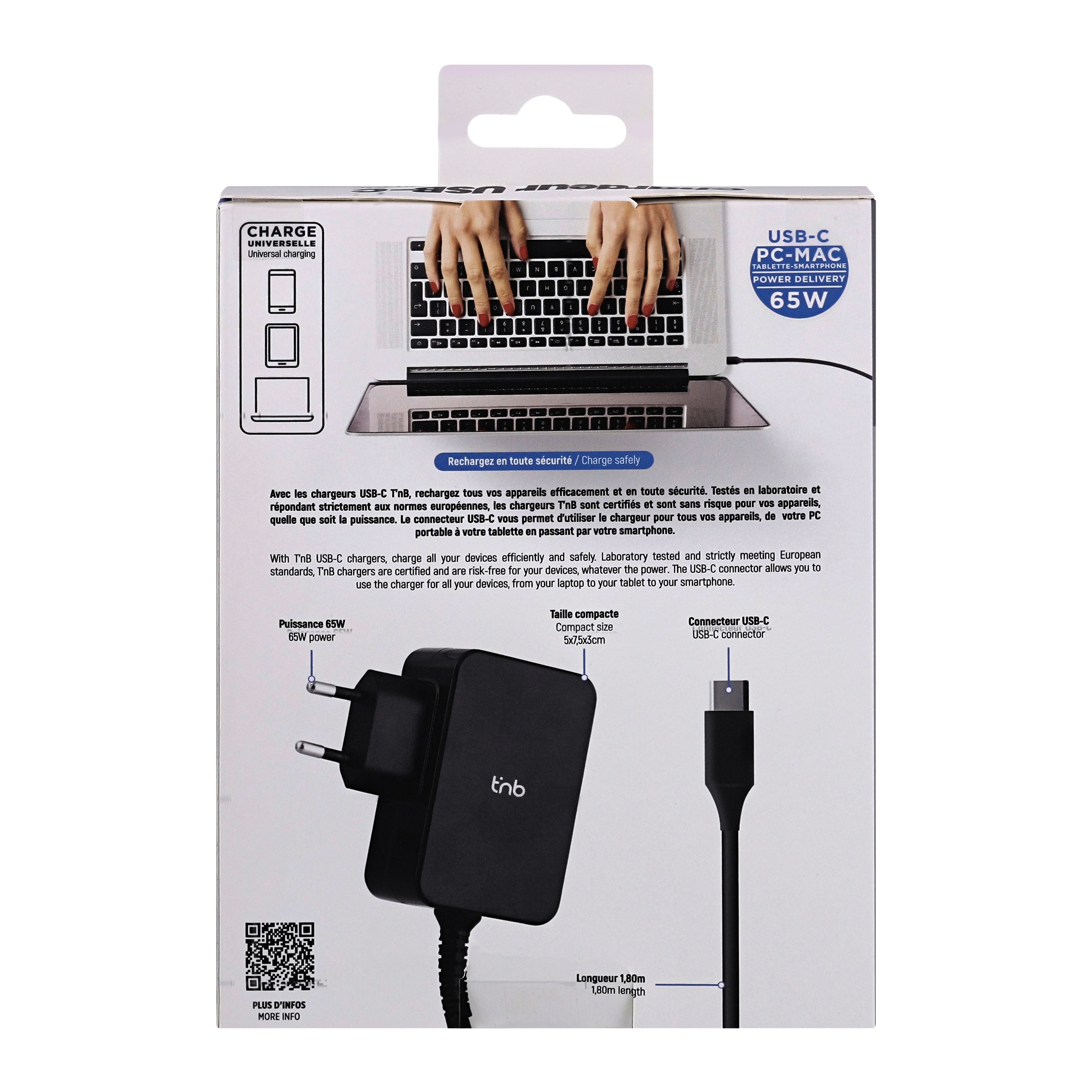 65W USB-C charger with wall plug. Compact dimensions to take it anywhere. Allows you to charge all your devices, smartphones, tablets, computers. Its 180 cm cable gives you good flexibility in your installation, wherever you are.
