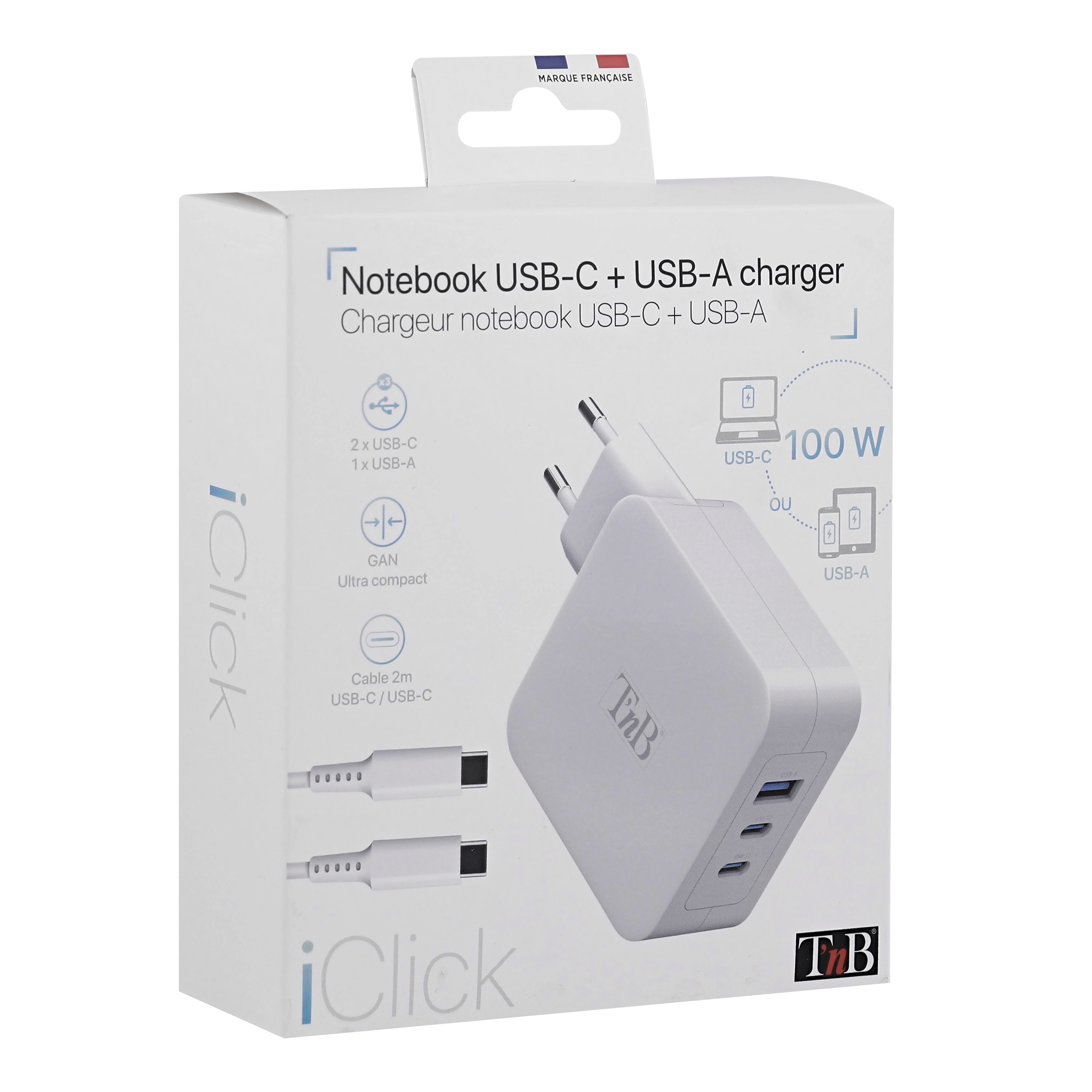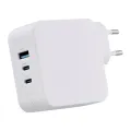 Universal charger with dual USB-C and USB-A quick charge connectivity. Ultra-compact, high-performance, and energy-efficient charger. Ideal for notebook PCs, tablets, smartphones in USB Type-C, this product also has a USB-A port to charge your phone at the same time as your computer. Thanks to these two USB-C ports, you can charge two notebooks simultaneously at a power of 45W. Delivers 100W via the USB-C ports and 18W maximum for USB-A charging. Comes with a USB-C / USB-C cable compatible up to 100W.
