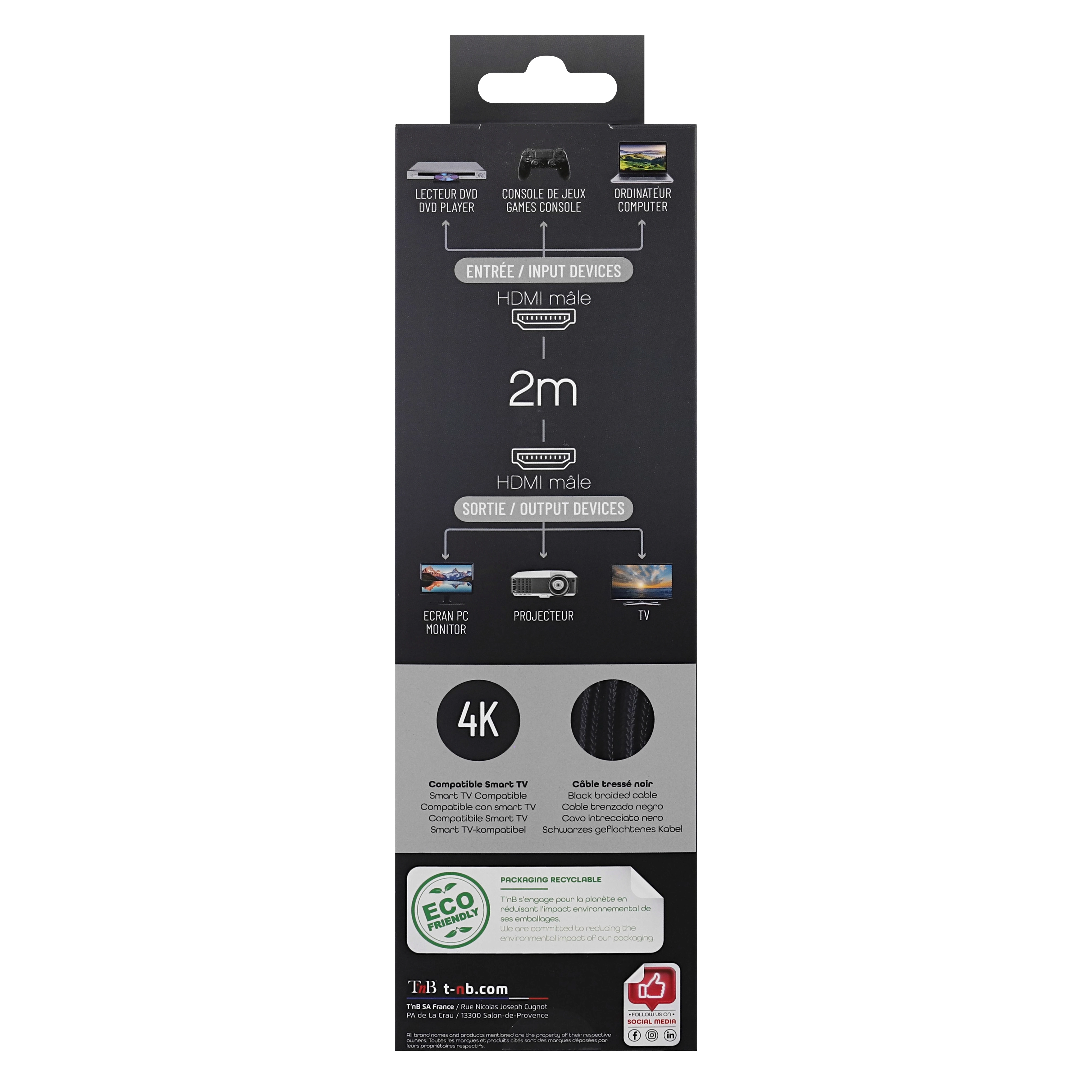 HDMI 2.0 4K Ultra HD 2160p cable for resolutions up to 4096x 2160 pixels (4K 30/40/60Hz). Triple shielding with nylon braiding, gold connectors with protective caps. Compatible with all 4K, HD and 3D TVs (1080p Full HD / Ultra HD 2160p) LED, LCD screen, plasma TV, video projector, computer screen. Compatible with the latest game consoles (PlayStation 4, Xbox One, Xbox 360, Playstation 3) as well as any other device with an HDMI socket (Blu-ray player, HD DVD, DVD, home cinema, media player, computer, Switch or HDMI splitter) Supported resolutions: 720i, 720p, 1080i, 1080p, 1600p, 2160p (Ultra HD) = 4096x2160p @60Hz maximum (4K 60Hz)