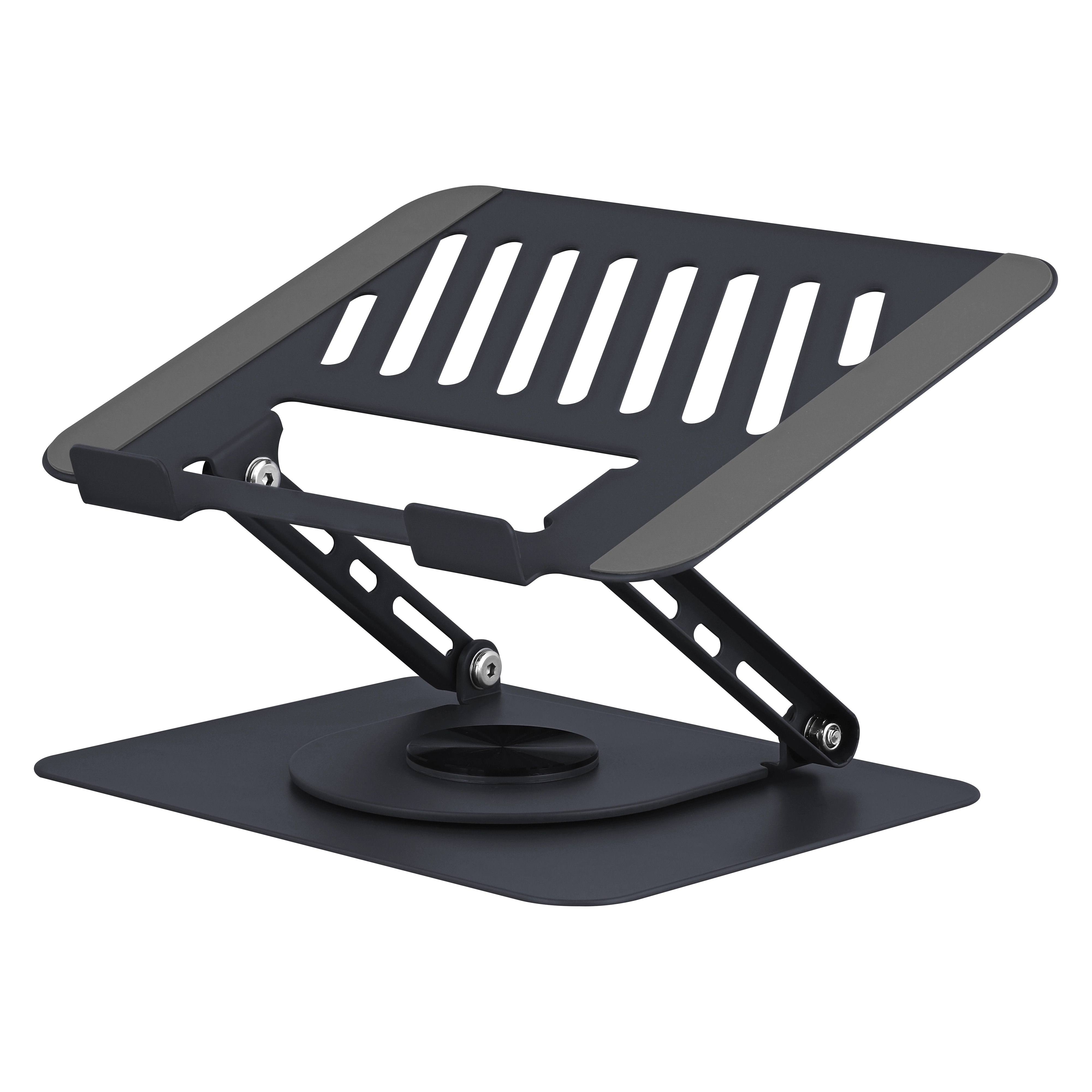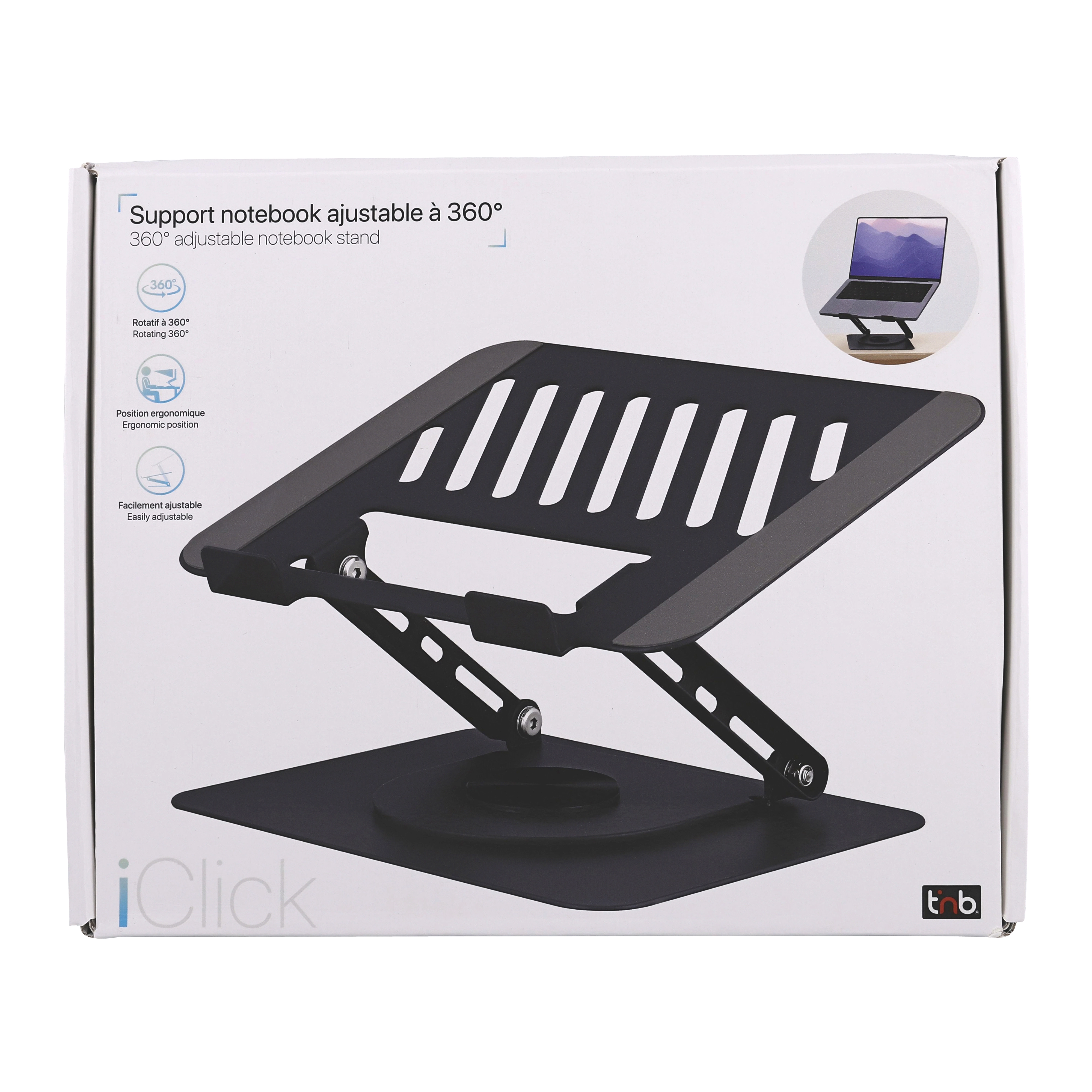 Adjustable metal iClick stand for notebooks up to 15 inches. Allows you to position your notebook at the ideal height for your setup. Retractable, tiltable, and precisely adjustable thanks to these two adjustment dimensions. Easily adjust the height of your notebook between 2cm and 17cm. Perfectly free tilt angle between 0° and 90°. Its non-slip pads allow for secure anchoring on the desk. The same goes for the pads on the top tray which allow optimal support of the device. Its rotating system with satisfactory and precise bearings allows for perfect adjustment of the position and to easily show content to colleagues.