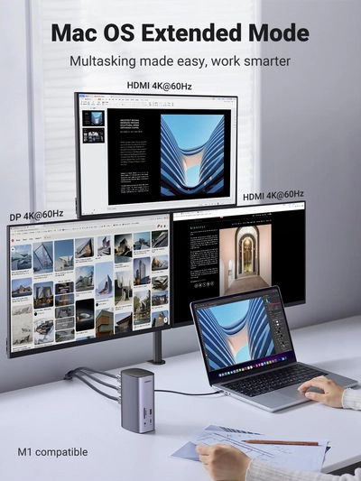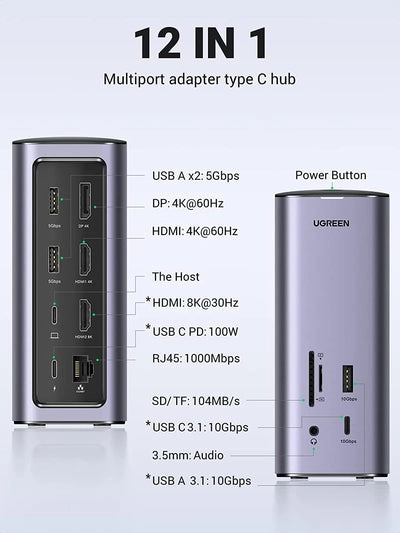 Ugreen USB-C Docking Station 12-in-1. Connectiviteitstechnologie: Bedraad. Kleur van het product: Zilver, Compatibele geheugenkaarten: MicroSD (TransFlash), Compatibiliteit: Lenovo Yoga Book, Dell XPS 13 9305, MacBook Pro /Air, HP Spectre x360 13, Dell XPS 15 BOOK. Gewicht: 748 g. Breedte verpakking: 177, 8 mm, Diepte verpakking: 116, 8 mm, Hoogte verpakking: 81, 3 mm