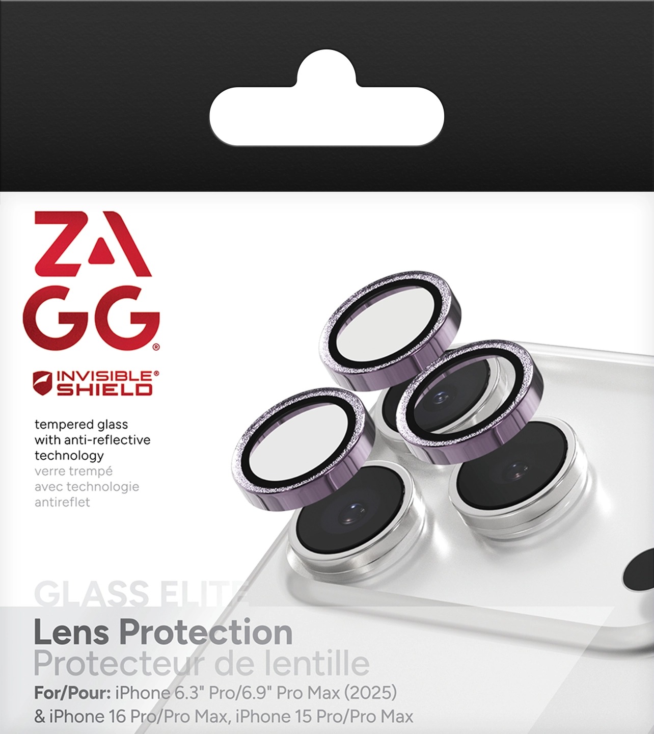 InvisibleShield Glass Elite. Merkcompatibiliteit: Apple, Compatibiliteit: iPhone 17 Pro/17 Pro Max, 16 Pro/16 Pro Max/15 Pro/15 Pro Max, Veiligheidsfunties: Stofafstotend, Schokbestendig, Krasbestendig. Materiaal: Aluminosilicaat, Kleur van het product: Paars. Aantal per verpakking: 3 stuk(s)
